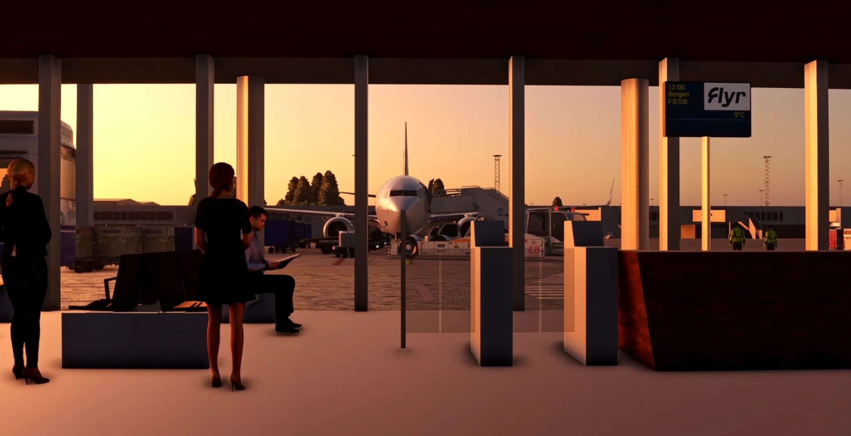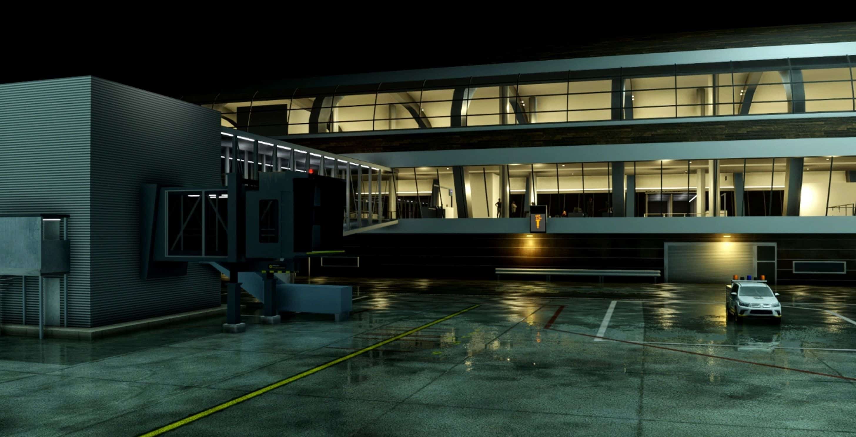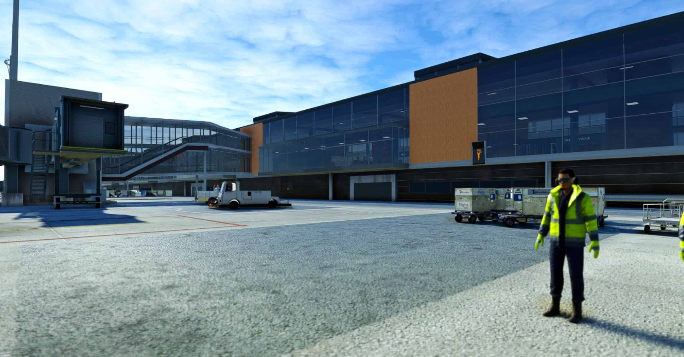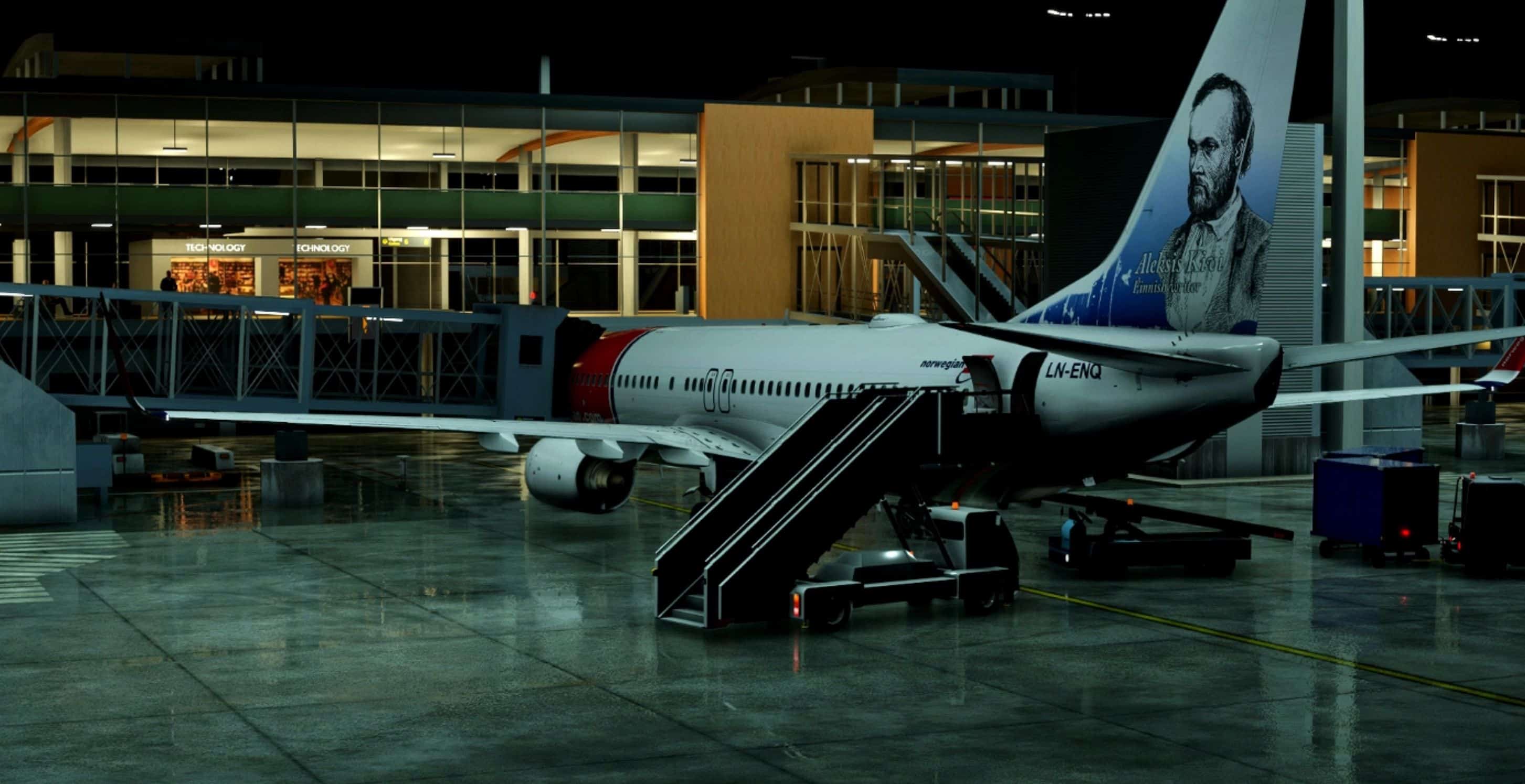 -Custom models of the whole main terminal, ATC tower, ENGM specific custom objects i.e. lamp posts, wigwag lights, VDGS (non-operational) at gates, blue and orange taxiway lights at blue and orange lines. Custom buildings at cargo apron, Norwegian and SAS technical hangars, white ground radars, east side buildings/hangars. Custom buildings for GA area and hangars around de-icing areas.