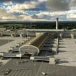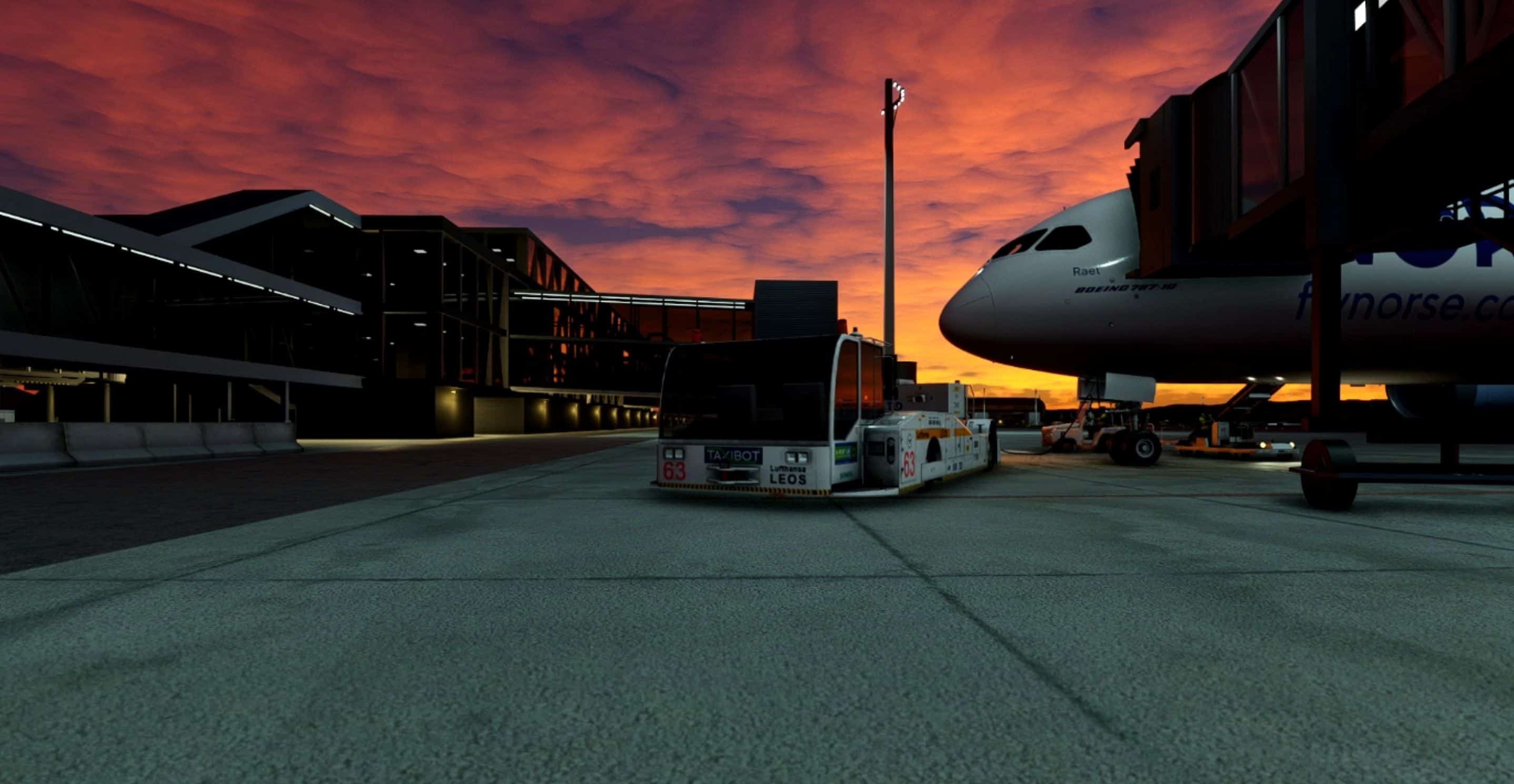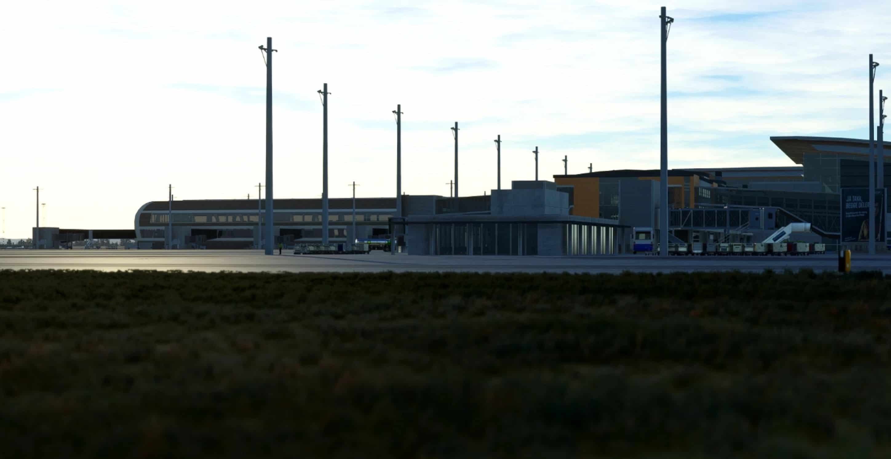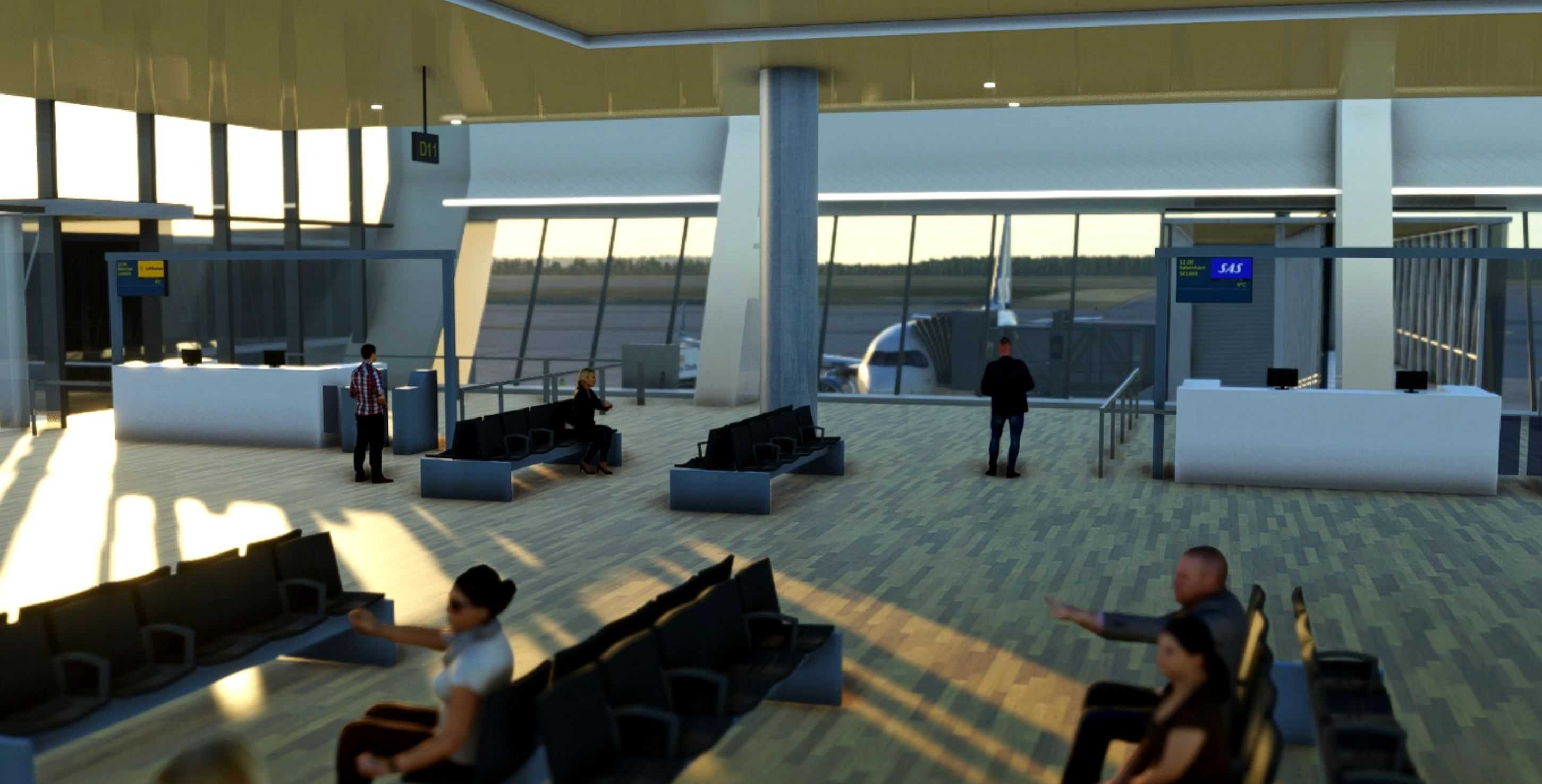 -Custom models of the whole main terminal, ATC tower, ENGM specific custom objects i.e. lamp posts, wigwag lights, VDGS (non-operational) at gates, blue and orange taxiway lights at blue and orange lines. Custom buildings at cargo apron, Norwegian and SAS technical hangars, white ground radars, east side buildings/hangars. Custom buildings for GA area and hangars around de-icing areas.