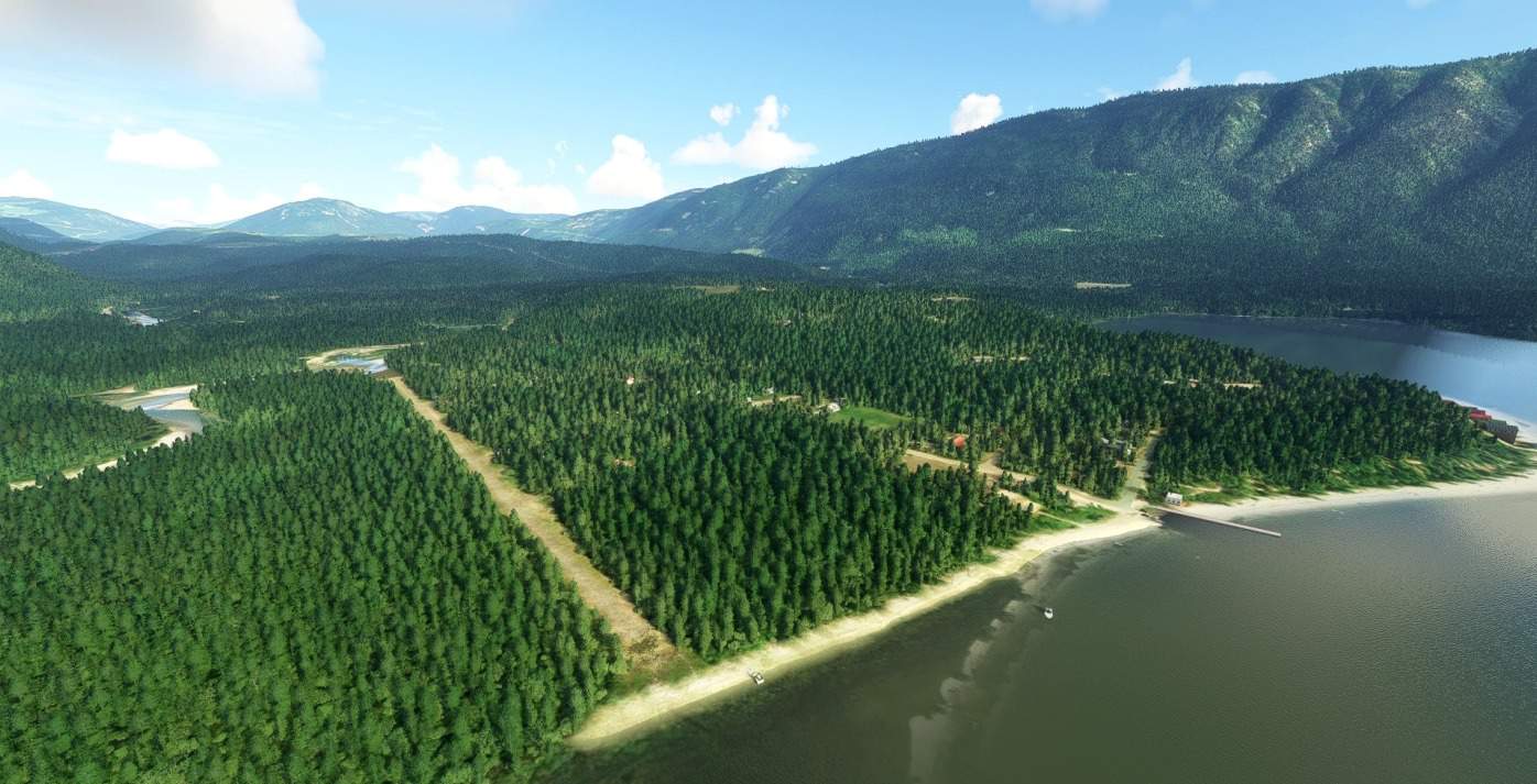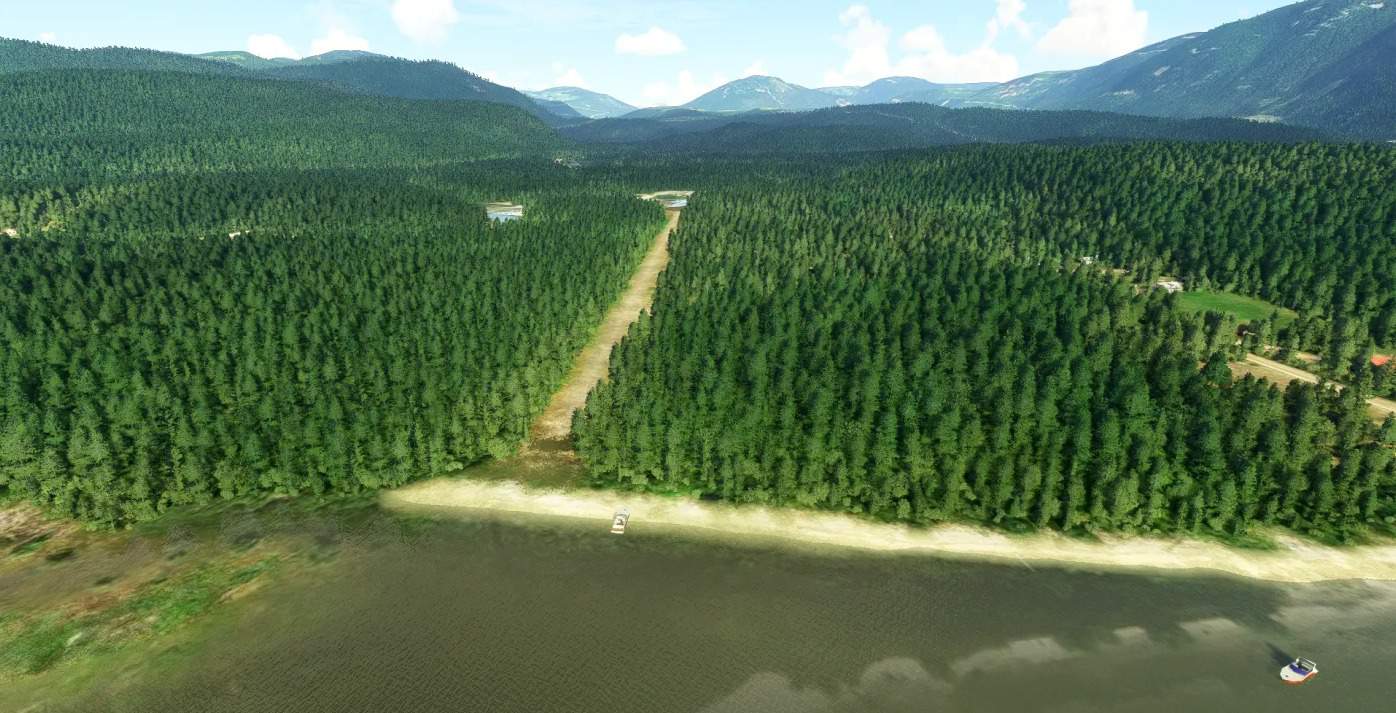 Welcome to Seymour Arm on the sunny Shuswap Lake, located approximately 65 nm northeast of Kamloops and 35 nm north of Salmon Arm. This little town lives life at a slower pace than most but attracts its fair share of campers/houseboaters through the summer months. The airstrip is little more than a line cut in the trees with parking at one end. The runway is relatively long at around 2400 feet but quite narrow between the trees. The strip is real but the ident is fictional as I couldn’t find reference to one.
