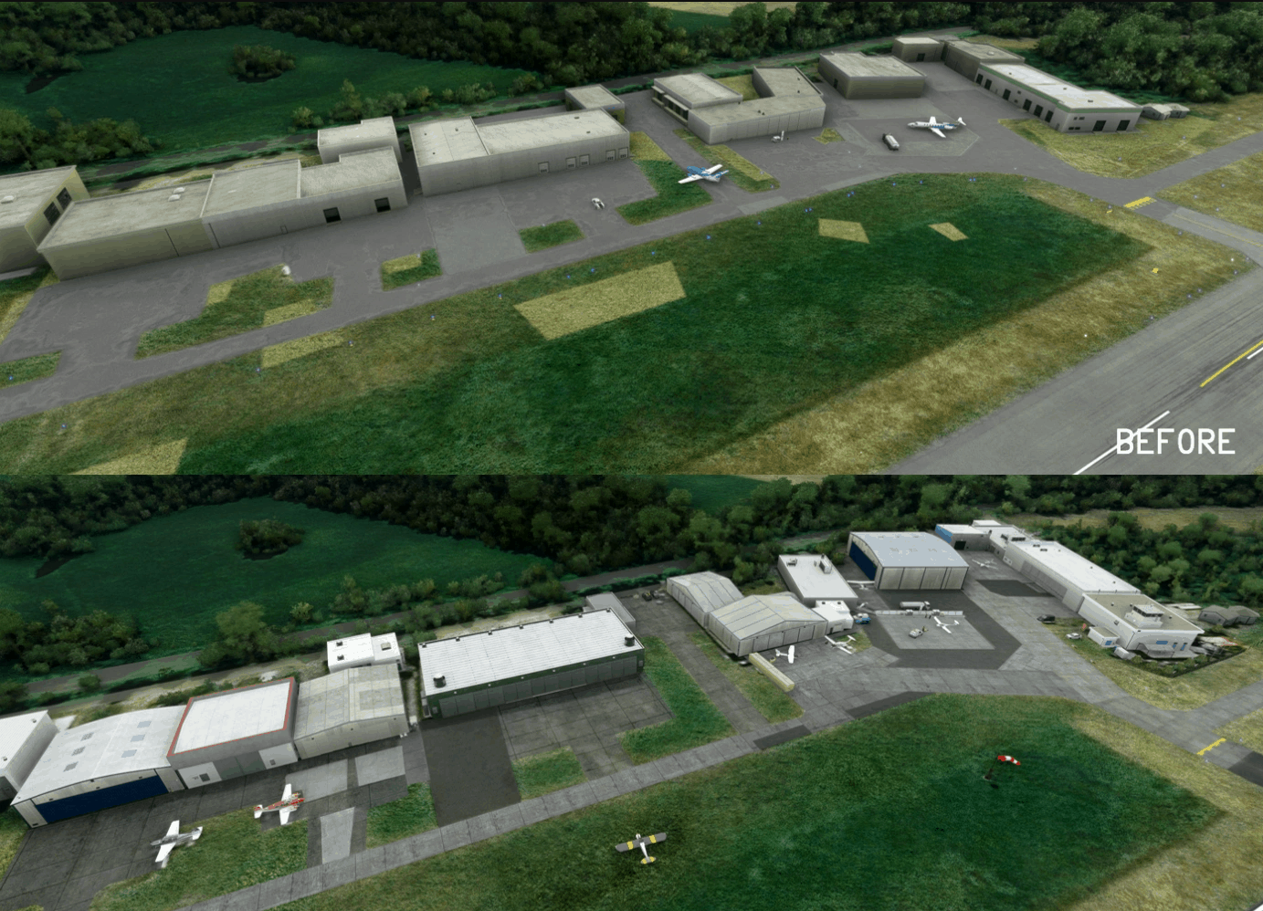 The airfield is a small General Aviation and training site located 50km south of Frankfurt that serves multiple aero-clubs and flight schools. Since the default version feels lifeless and empty I have attempted to create a first version that better resembles the real airfield using stock objects only.