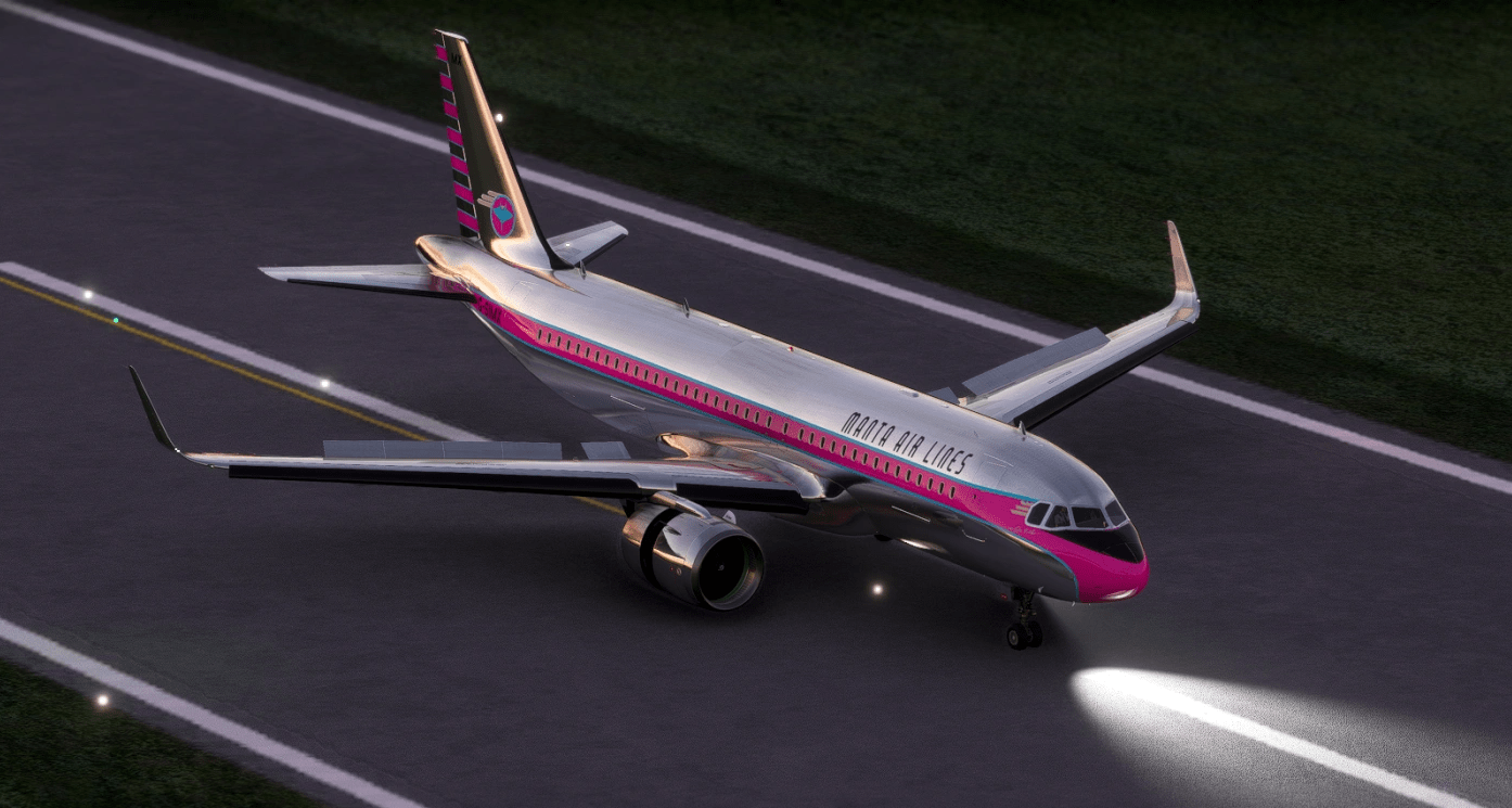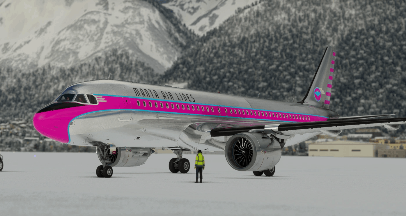 Presenting the A320neo depicted in a 1950s version of the fictional Manta livery of YouTuber 320 Sim Pilot. 320 Sim Pilot has been kind enough to use some of my liveries on recent streams and this was my way of showing some appreciation for him and the fantastic work that he does with his A320 tutorials and streams in helping myself and others get to grips with the airliner. Also, thanks to his discord which is full of lovely people who have been very encouraging as well as offering plenty of great suggestions for classic liveries to recreate.