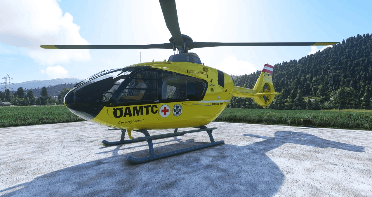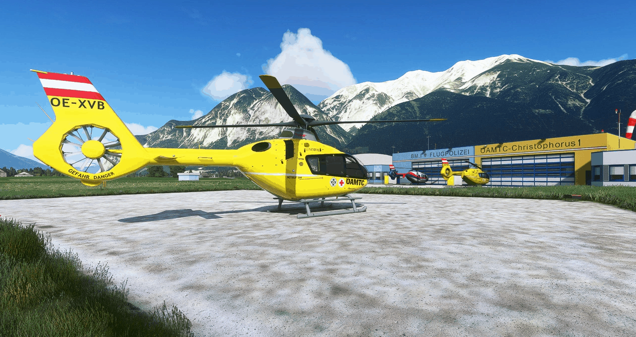 The real OE-XVB is a EC 135 T3 Helicopter with Alpine Skids and belongs to OEAMTC Flugrettung (Air Rescue) in Austria. Christoporus 1 is based at “Flugrettungszentrum West” (Air Rescue Center West) in Innsruck by the Airport, at the same base is also the Air Police stationed.