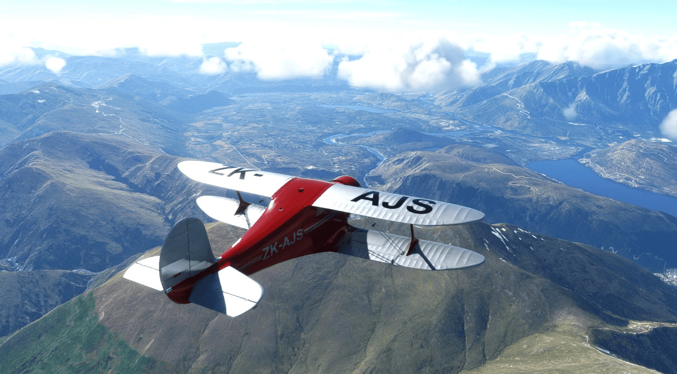This folder contains a repaint for the Beechcraft D17 Staggerwing for MSFS by Carenado, in the colors of Beech D17 Staggerwing ZK-AJS (c/n 107). This was the former ZK-AEU after doing its wartime service (albeit almost permanently laid up for repairs) as NZ573. It was operated by the Auckland Aero Club on air ambulance and charter work. It was repainted very nicely in full ‘Beechcraft’ standard markings in red and silver. ZK-AJS was exported to Australia in 1955 becoming VH-BOU. After being re-registered VH-PMG in 1963 and VH-TOT in 1964, it had an accident in 1967 and was stricken off the register. Repaint by Jan Kees Blom, based on the textures by Carenado.