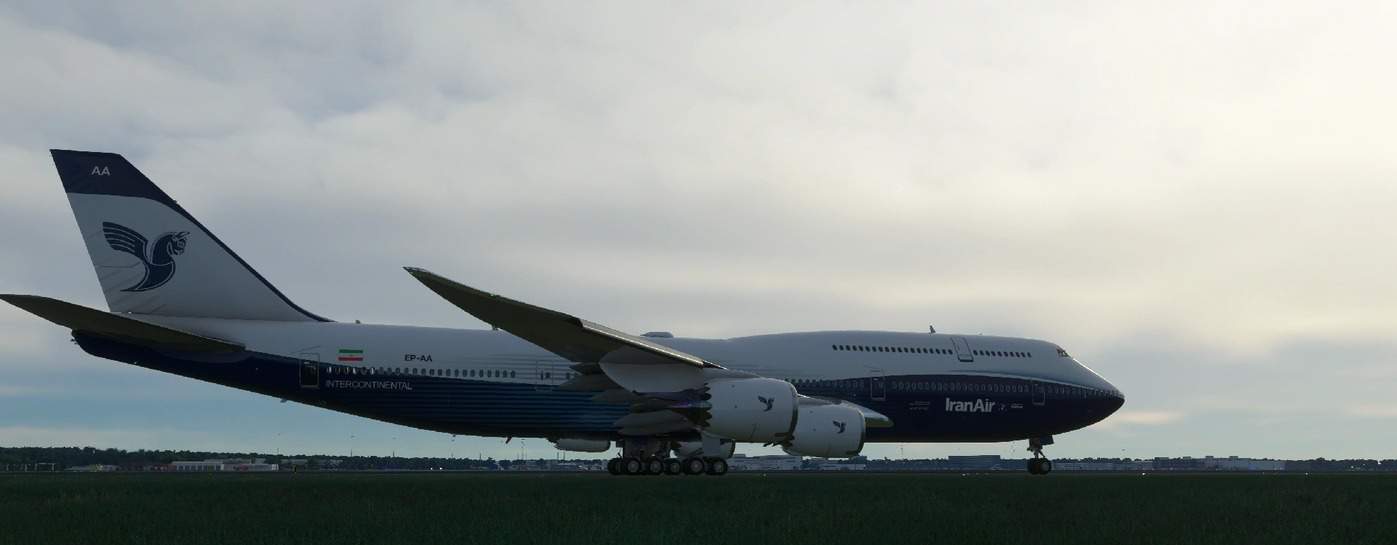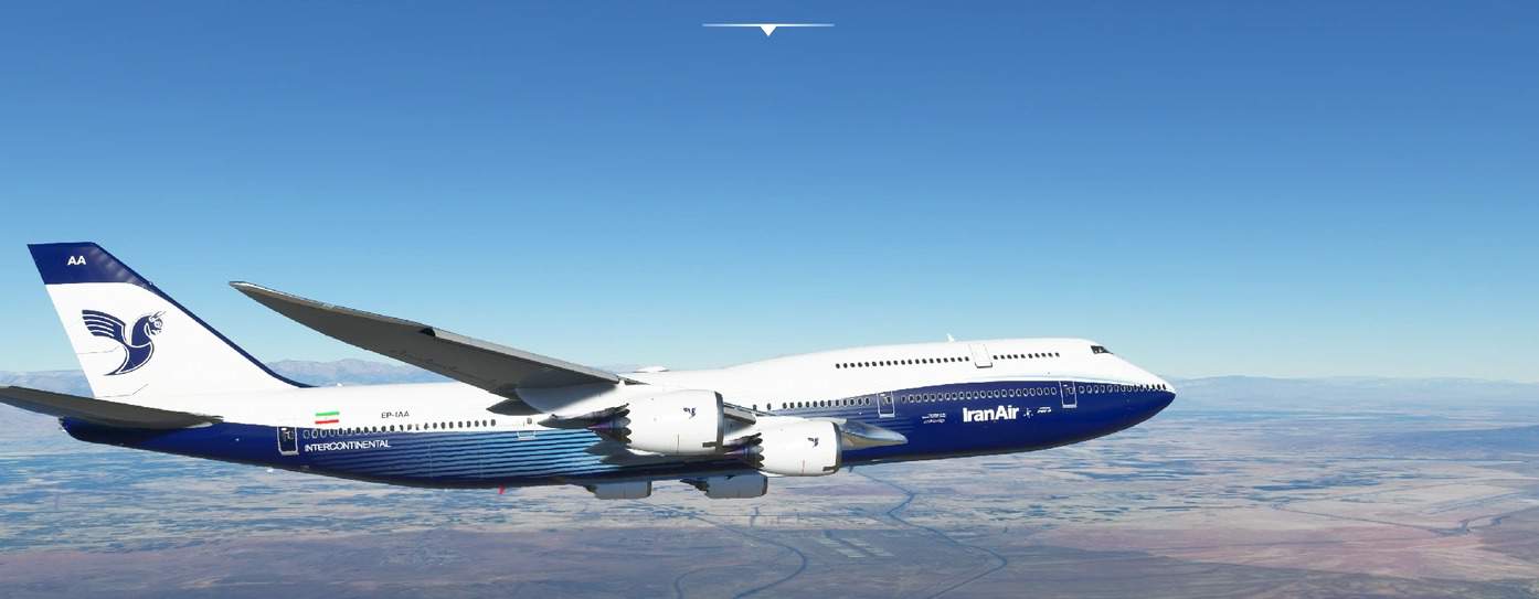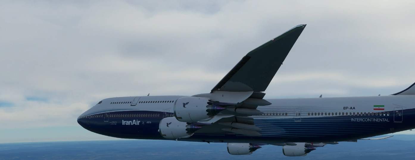 B747-8 repaint in special Iran Air ‘Boeing House Colors’ livery. This is a fictional repaint and registration, although Iran Air was very close to receiving two 747-8’s in 2017 which unfortunately did not materialize. The livery was a result of trying to work a symmetrical color scheme with the default 747-8 texture limitations in MSFS 2020. I think the Iran Air tail goes well with the Boeing colors…
