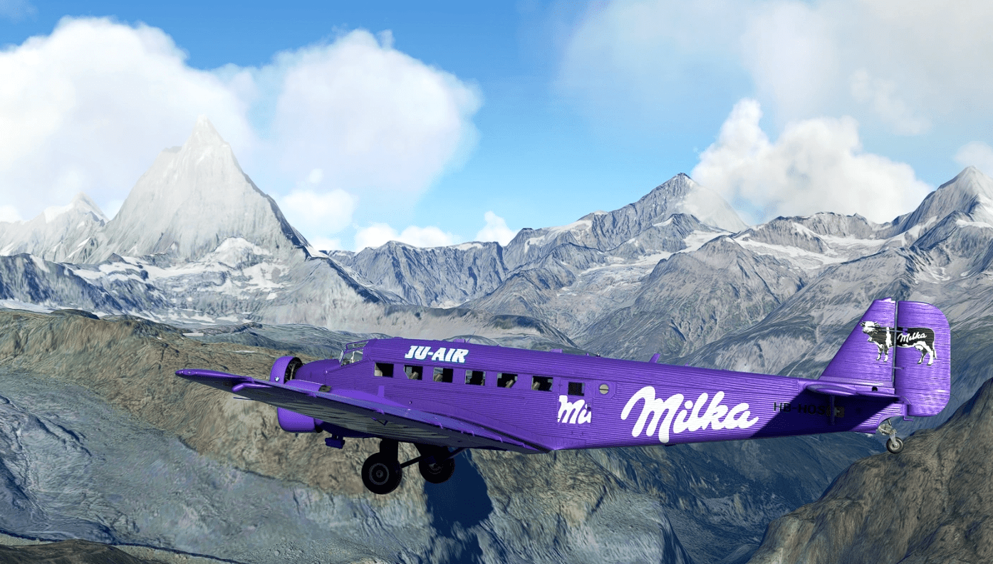 This repaint shows Junkers JU-52/3mg4e HB-HOS of Ju-Air. Built in 1939 as c/n 6580 and was delivered to Swiss Airforce as A-701. Left fleet 1981. Famous Ju-Air has been using the HB-HOS since 1983. In 1996 the HB-HOS becomes an advertising media platform Milka-JU again wearing this Milka paint scheme until 1998.