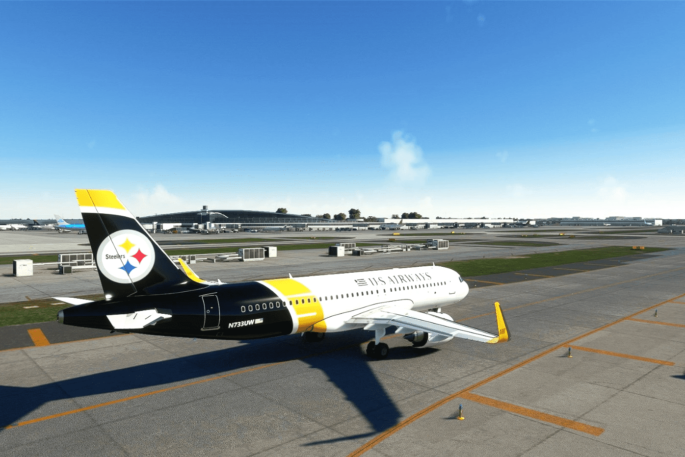 N733UW is an old US Airways A319 with the Pittsburg Steelers livery.