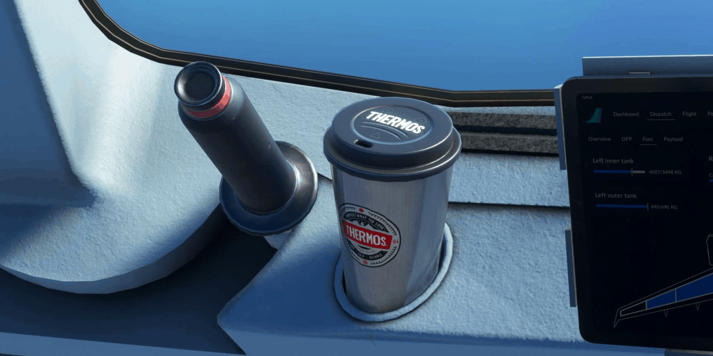 I was flying over the virtual landfill where all of the A32NX Cups are dumped. The pile is getting quite large, in fact. So, to solve the problem, I’ve created reuseable insulated cups. Now you can enjoy your coffee (or what ever your drink of choice may be) in a re-useable metal cup. Just wash and dry after your flight and you’re good to go for the next one. No more waste.