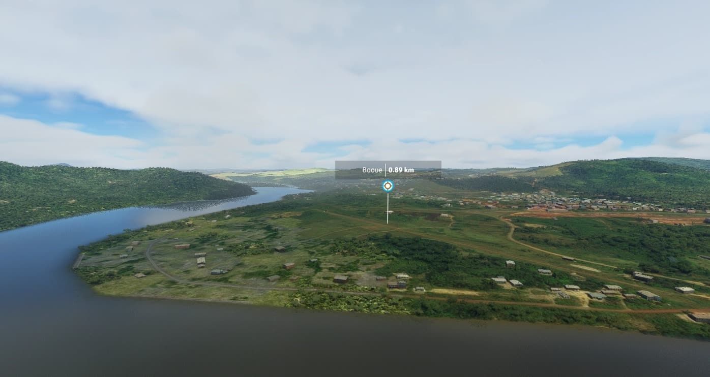 The seventh leg, +36 km from average core leg distance. You cross the half-way distance of this bush trip on the way to this legs first waypoint during which also you see the Congo river the last time along this trip and you cross the equator for the third time. Around a quarter of the distance between the first and second waypoint after the first waypoint you also cross the half-way longitudinal distance of this bush trip. You are about to enter the mountaineous region of this trip. At the end of this leg you land on the second grass runway along this bush trip, that runway has the shortest length of all runways along this trip.