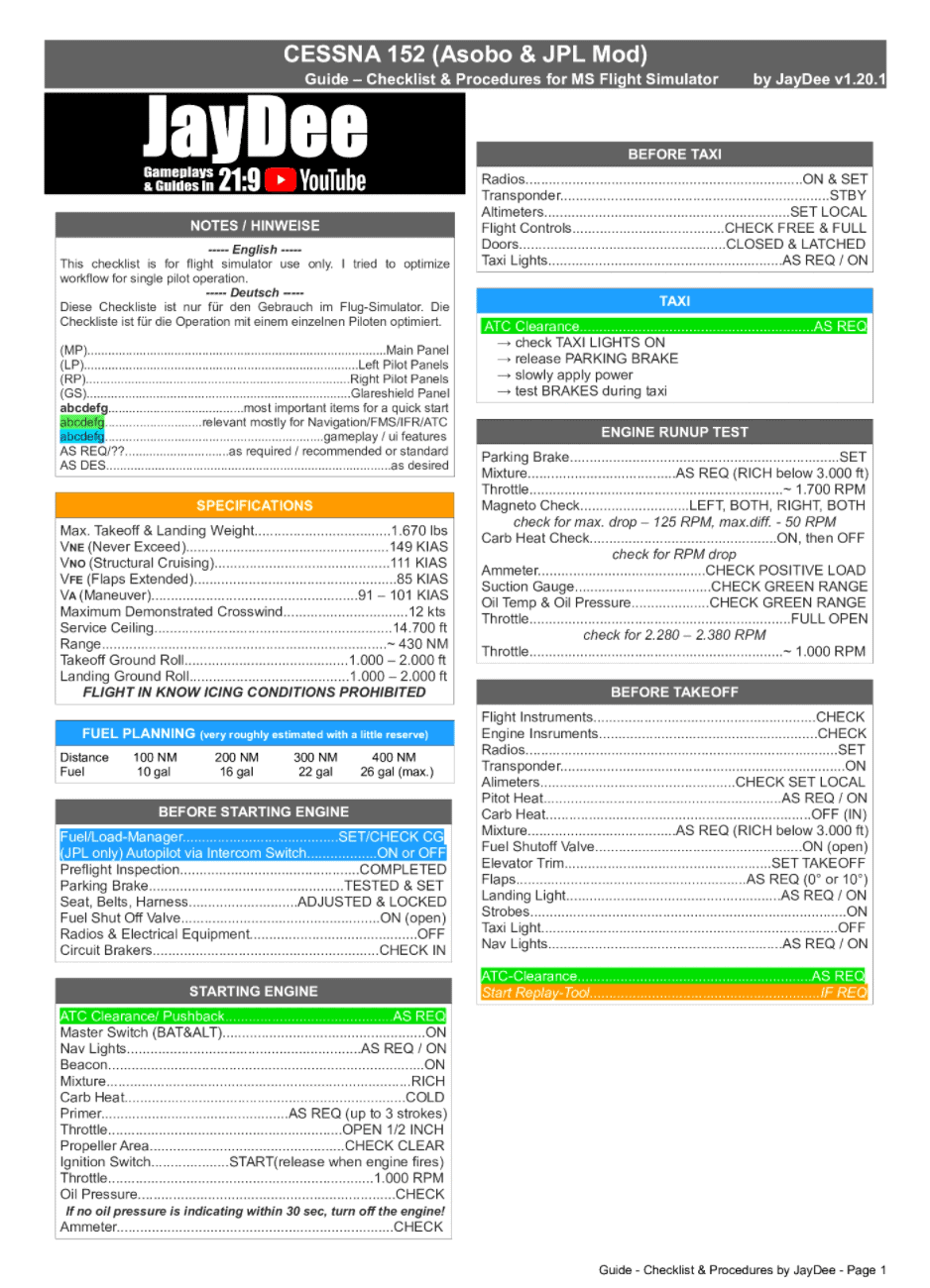 Cessna 152 – JayDee´s Checklist & Procedures (PDF) v1.20.1