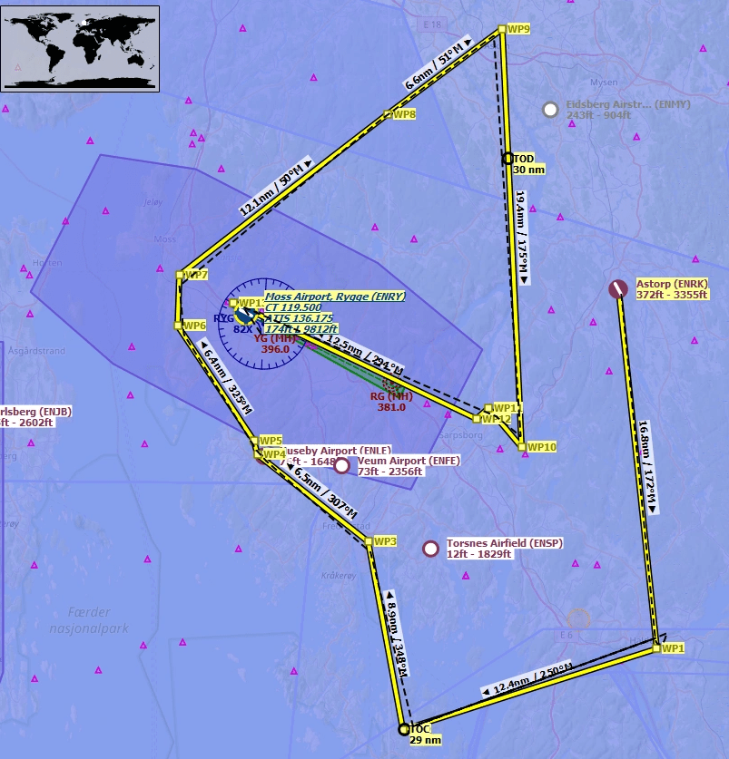 The flight takes you across all the golf courses in the county of Østfold in Norway (now part of Viken) and you also fly into Swedish airspace for a few miles. The landscape is quite flat with many lakes, rivers and seas. Do you find the last course?