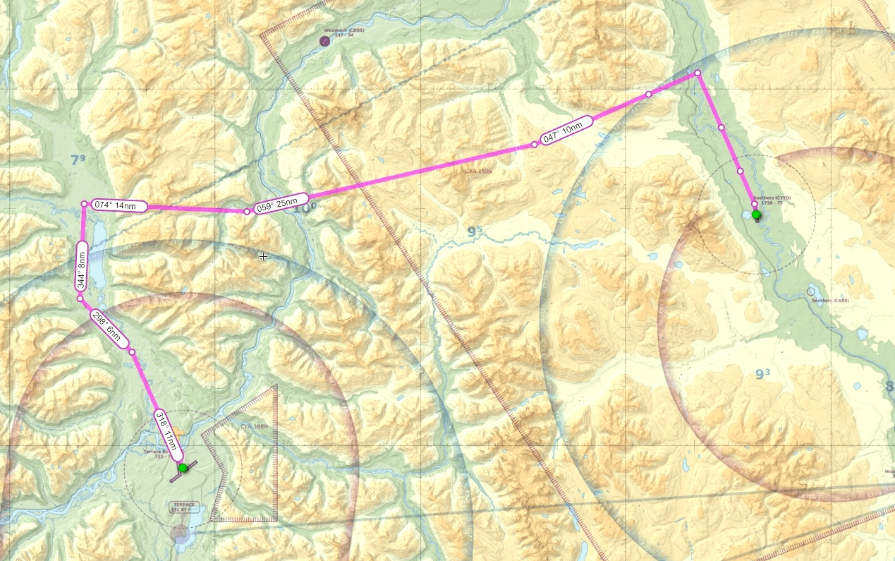 Here are 4 GPS IFR flightplans from Terrace BC CYXT to Smithers BC CYYD. The route is just over 90 miles flying distance.