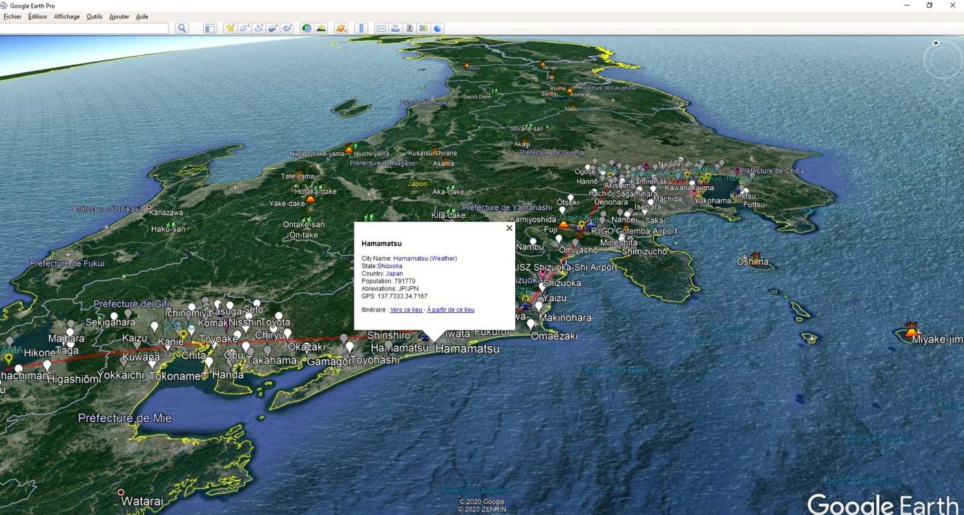 Place the KML file (Japan_Points_of_Interest.kml and KML_Japan_flightplan.kml) in your Google Earth documents folder or anywhere you like.