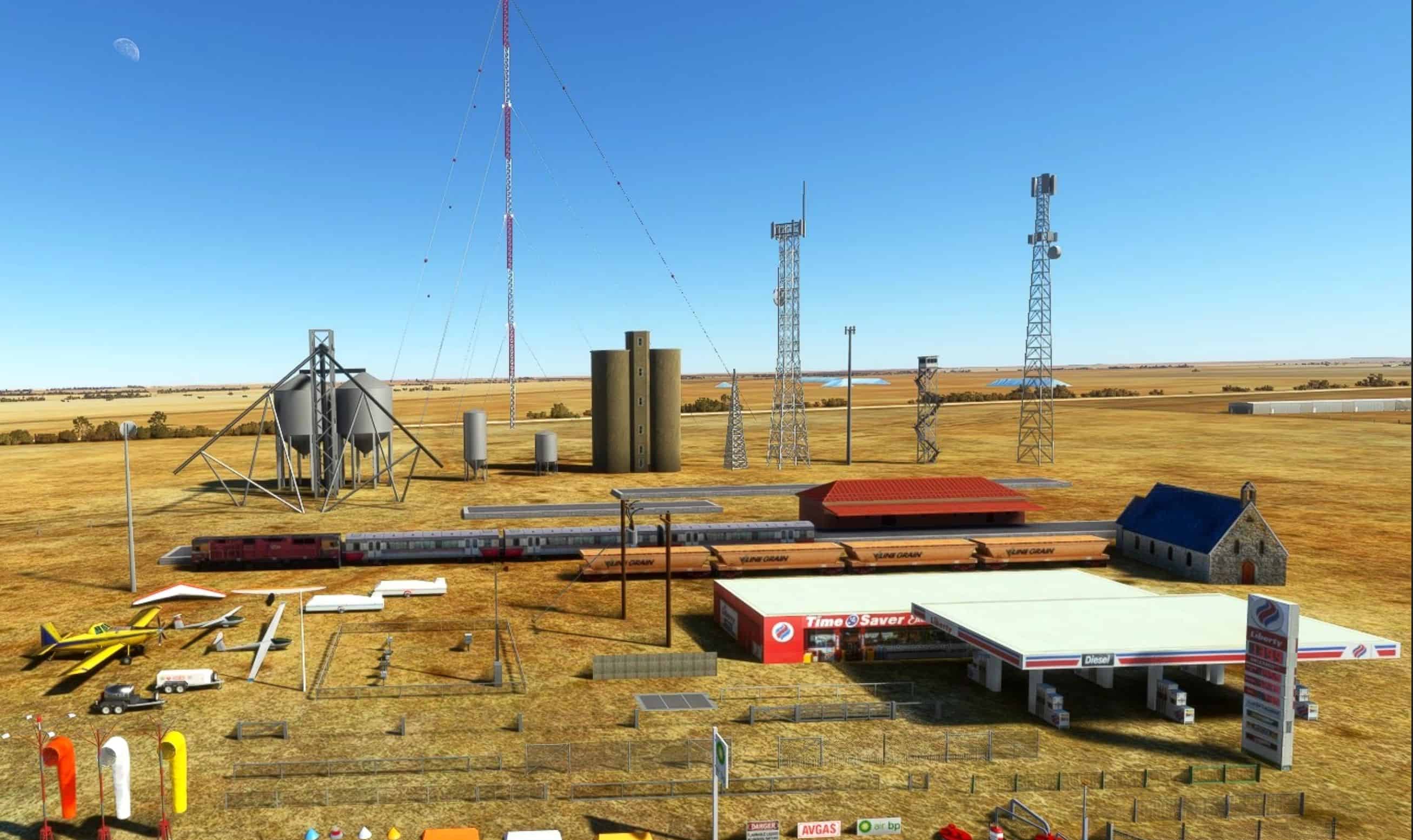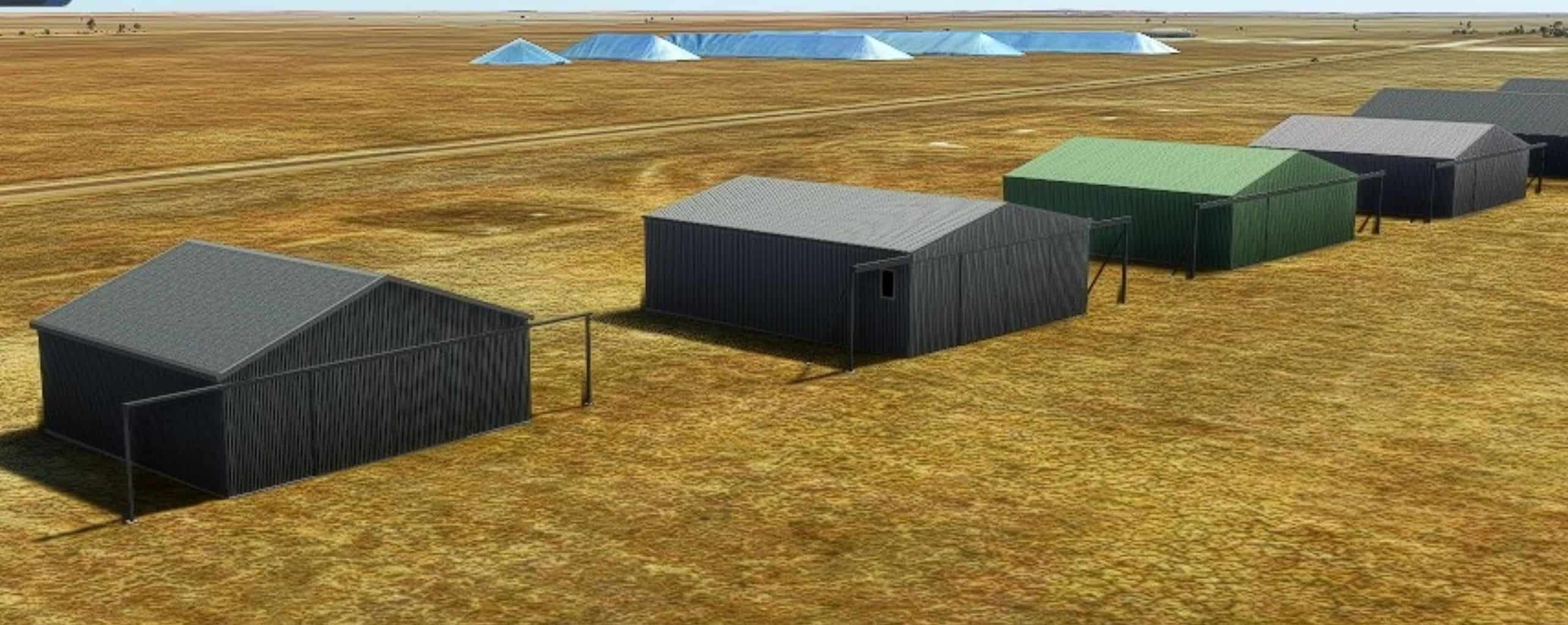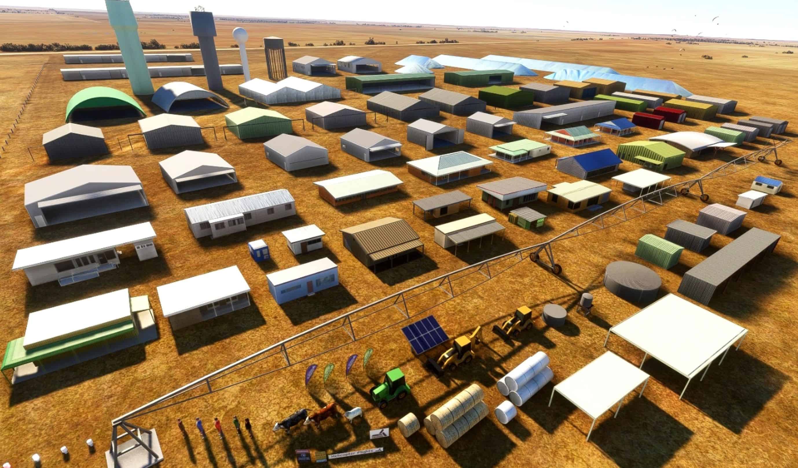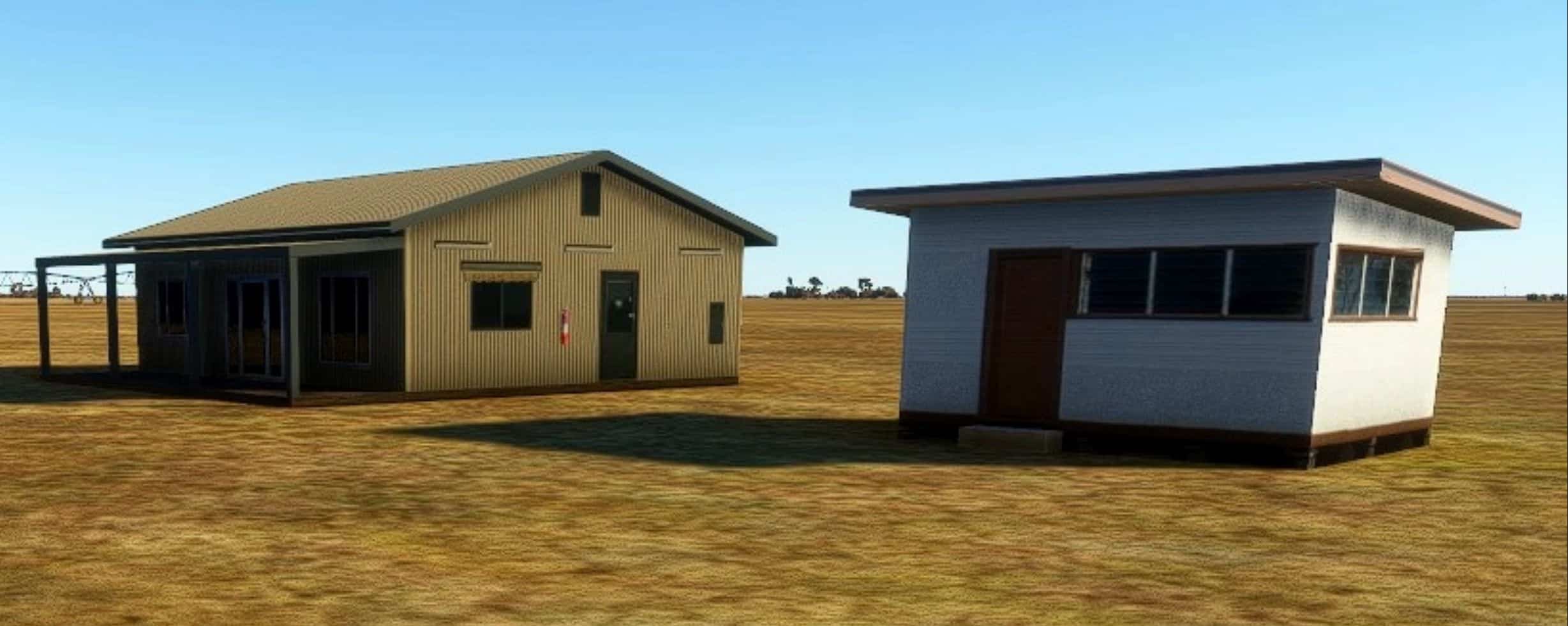 There are 11 open hangar objects based on ‘Open Hangar Library’ by Windhover who has generously supplied the raw Blender files for others to use. These look identical to the originals but have been heavily modified to be frame rate friendly. The triangle count is reduced by more than 40% plus LOD (Level Of Detail) simpler models produced which are used as the viewing distance increases. Final long distance models have only 15 triangles.