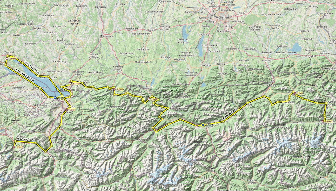 You start cold and dark in Zell am See (LOWZ) and fly to St. Johann, Innsbruck, Hoefen, Agathazell, Wildberg, Althenrhein, then around Bodensee taking a stop in Stahringen at the north-west side of Bodensee, then back to Dornbirn and finally land on the Military Airfield of Mollis in Switzerland.