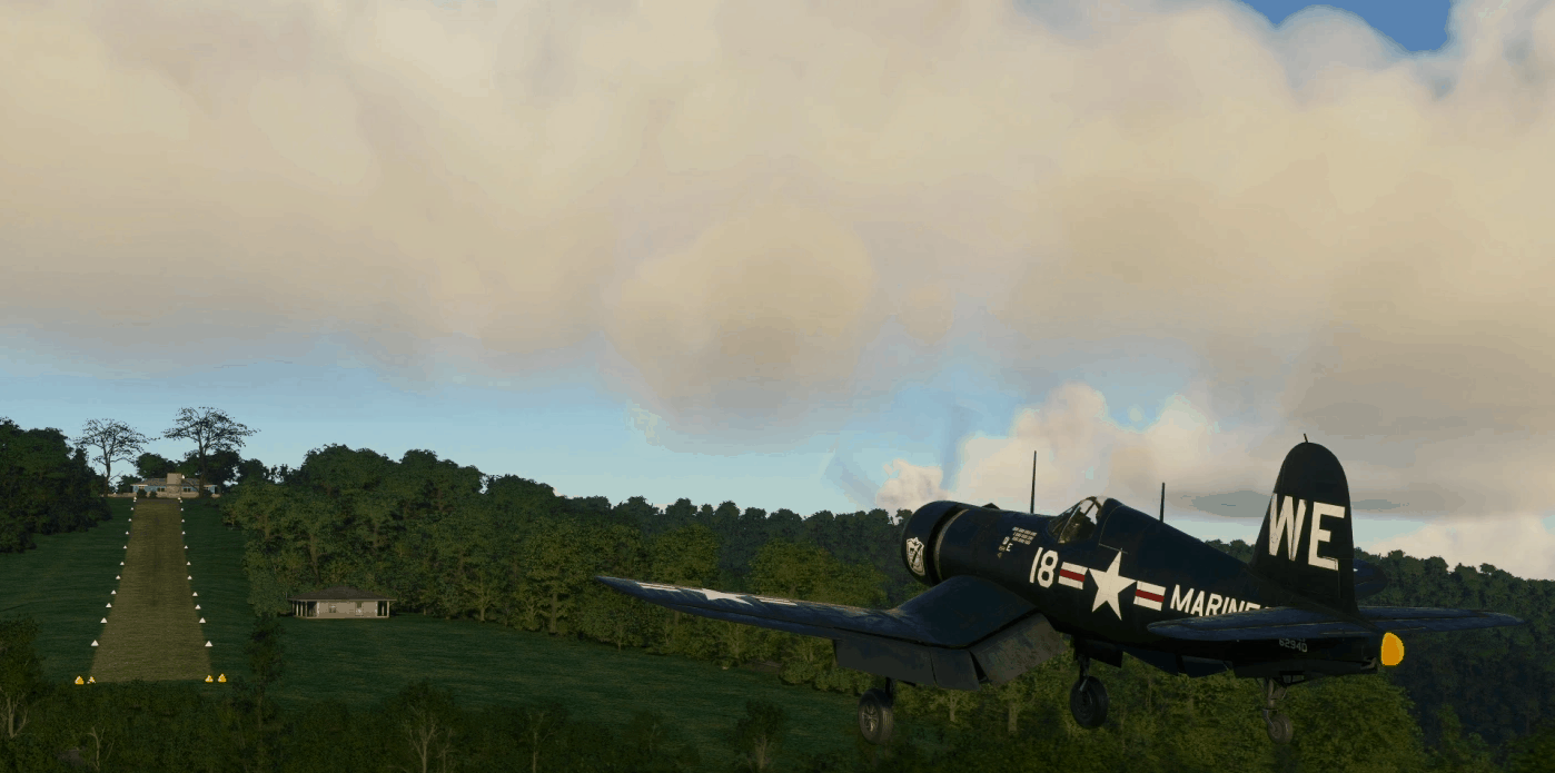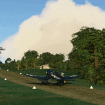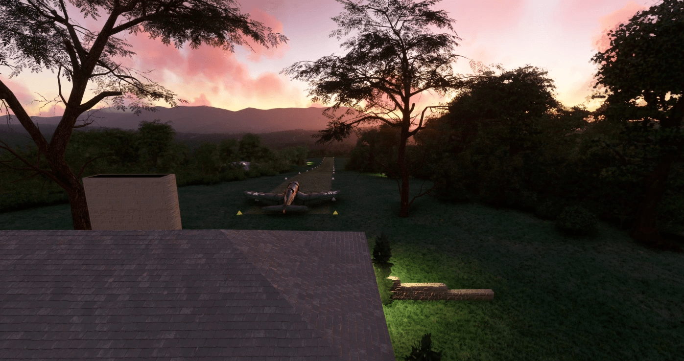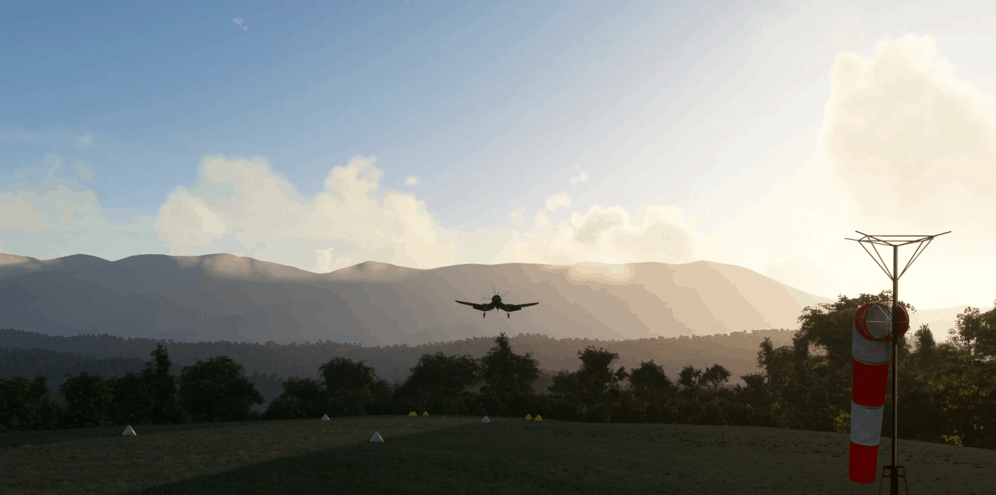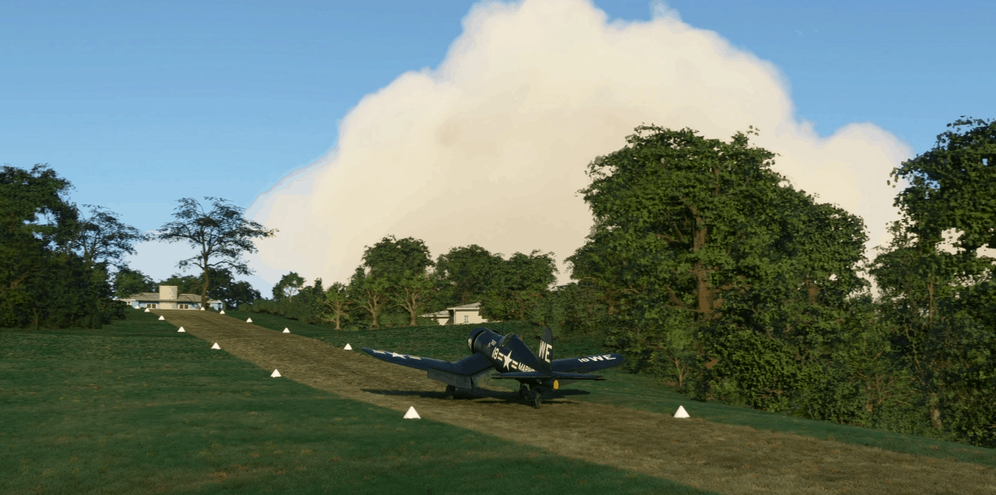 Strawberry Ridge has a unique offsite “ramp” of sorts located to the north east, requiring taxing through a narrow trail between trees to get to the runway. The terrain in that area is not as precise as I had less data other than peripheral views from some drone photographs. There’s also a place to park near a house at the lower western end of the runway. The buildings are AI generated, other than the shed 1/3 of the way from the top of the hill and the house at the top of the hill which is the other unique feature of this airfield since it forms a very visible landmark marking the end of the runway. The AI generated version was located behind the hill and and the shed was located on top of the hill, so those two structures were erased. The shed is from the SDK scenery library and the house is my first attempt at modelling for a game environment, using Blender for the first time. I’m hoping to learn to model and texture better in the future, so any tips would be greatly appreciated, or any model contributions to replace this house and other structures at this airfield would be welcome!