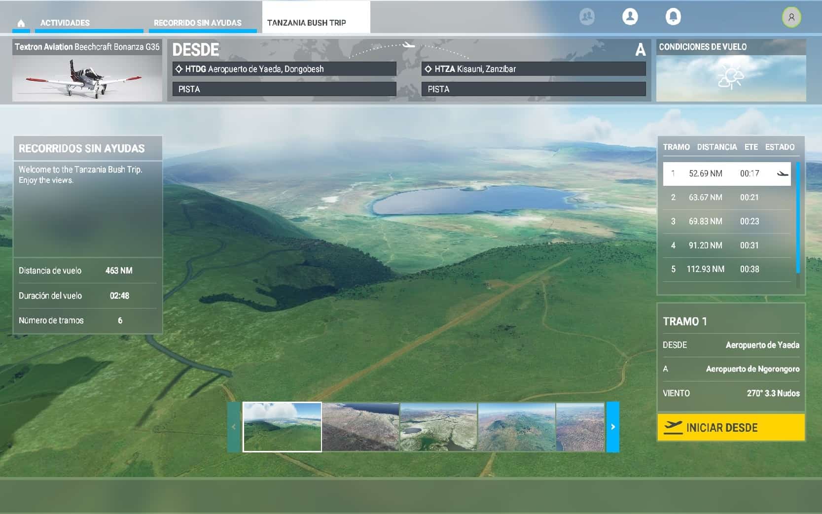 The Tanzania Bush Trip has six legs and can be completed with two different planes: Beechcraft Bonanza G36 and XCub. I think the route is best suited for the Bonanza G36, but if you want to take it slow and use the XCub (my favourite plane) then suit yourself. It takes three hours to complete the route with the Bonanza, and four hours with the XCub.