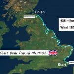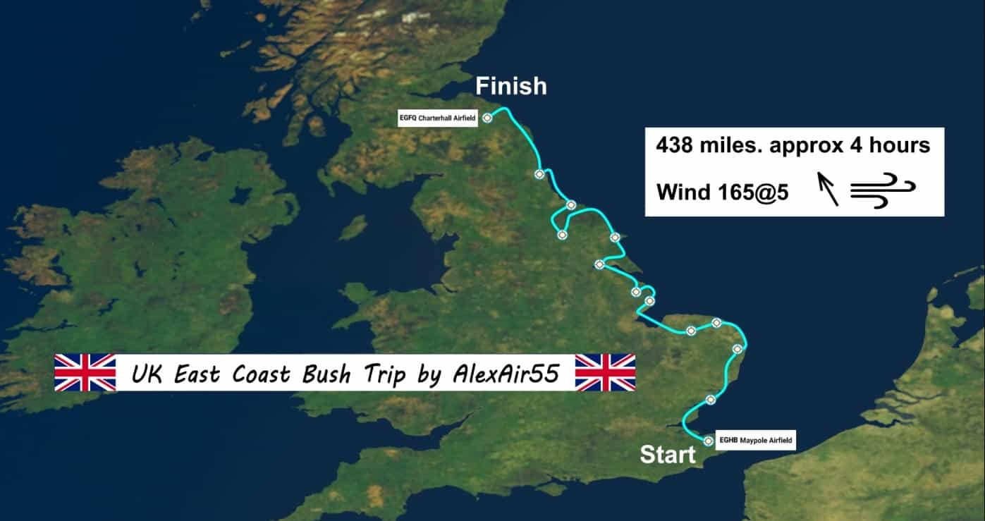 This is a 12 leg bush trip from Kent on the southeast coast of the UK mainland, flying north along the east coast to the Scottish boarders.