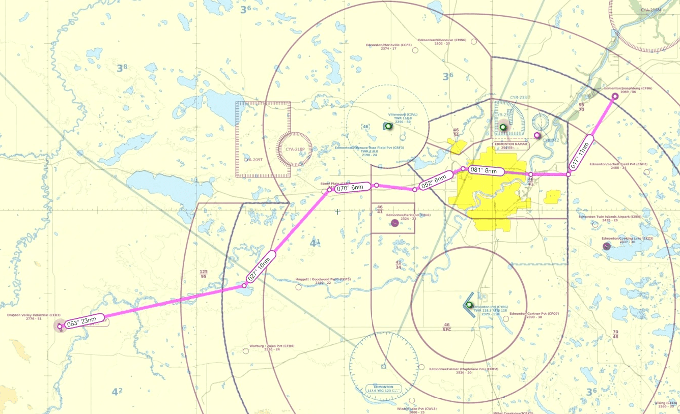 This is a VFR GPS flightplan route from Drayton Valley Alberta CER3 to Edmonton Josephburg CFB6. The route takes you up and across the city of Edmonton using the published VFR route.