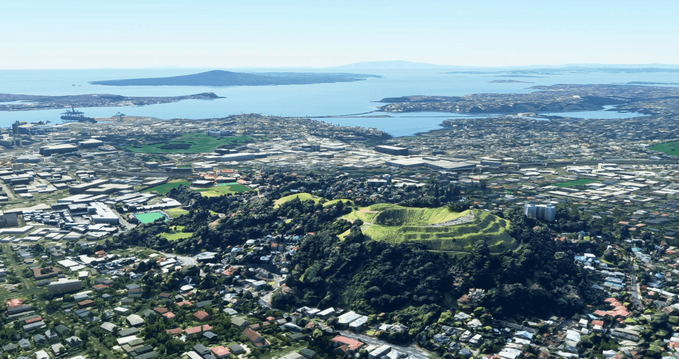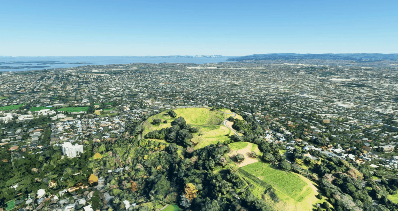 This mod is an upgrade for Mount Eden in Auckland, New Zealand. It does use photogrammetry data to make it look more accurate to the real world mountain, however it does come with the side effect of photogrammetric trees. It looks fine when flying over, but its shortcommings become apparent when you get up close and personal. The last two photos are of the default Mount Eden,