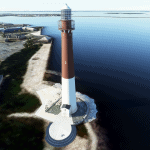Barnegat Lighthouse (Barnegat Light or “Old Barney” to the locals) is a historic lighthouse located in Barnegat Lighthouse State Park at the northern tip of Long Beach Island, in the borough of Barnegat Light, Ocean County, New Jersey, United States. It lies on the south side of Barnegat Inlet. It is the second lighthouse to be built there, the first being a 40-foot-tall fifth order light built in 1835. By 1850, the sea had encroached over 400 feet towards the light, and an increase in both north-south coastal traffic and ships entering Barnegat bay made replacing the early lighthouse with a new, taller, first-order light a priority.