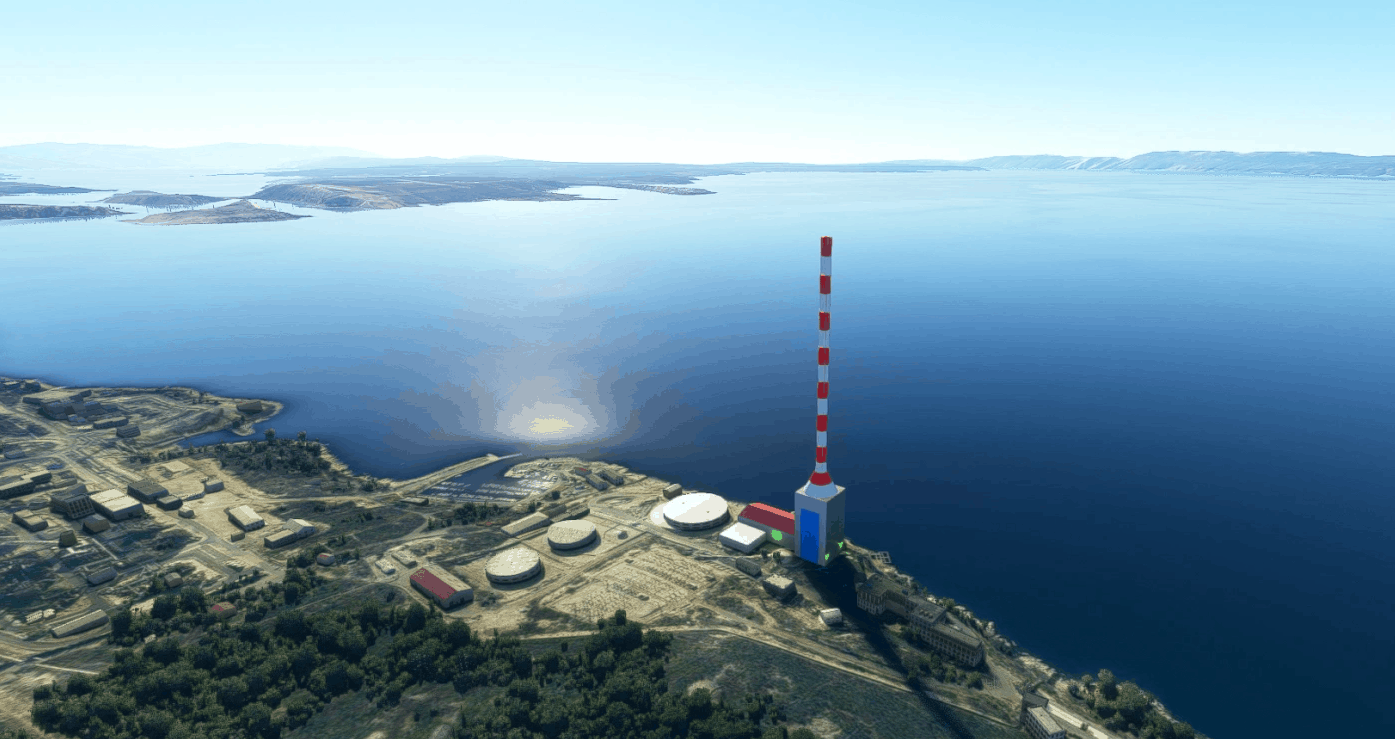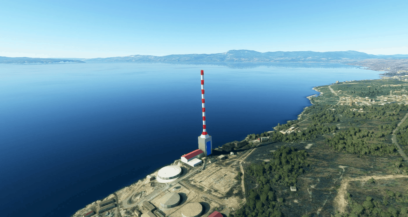 Power plant “Urinj” is located 8 kilometers from city of Rijeka and airport Rijeka (LDRI). It includes 250 meters high chimney and power plant building next to it. This structure is seen from big distance and its also located next to approach path for LDRI runway 14. It includes basic night textures. This addon removes generic tower placed by MSFS on this location.