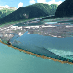 Snettisham Alaska is located only a few miles southeast of Junea, and a short hop from my previous scenery, Excursion Inlet. The dirt runway sticks out into the water, and the approach can be dangerous in low visability as the airport sits at the end of a long glacial bay with a zig-zagging inlet bordered pertruding high cliffs and mountainsides.