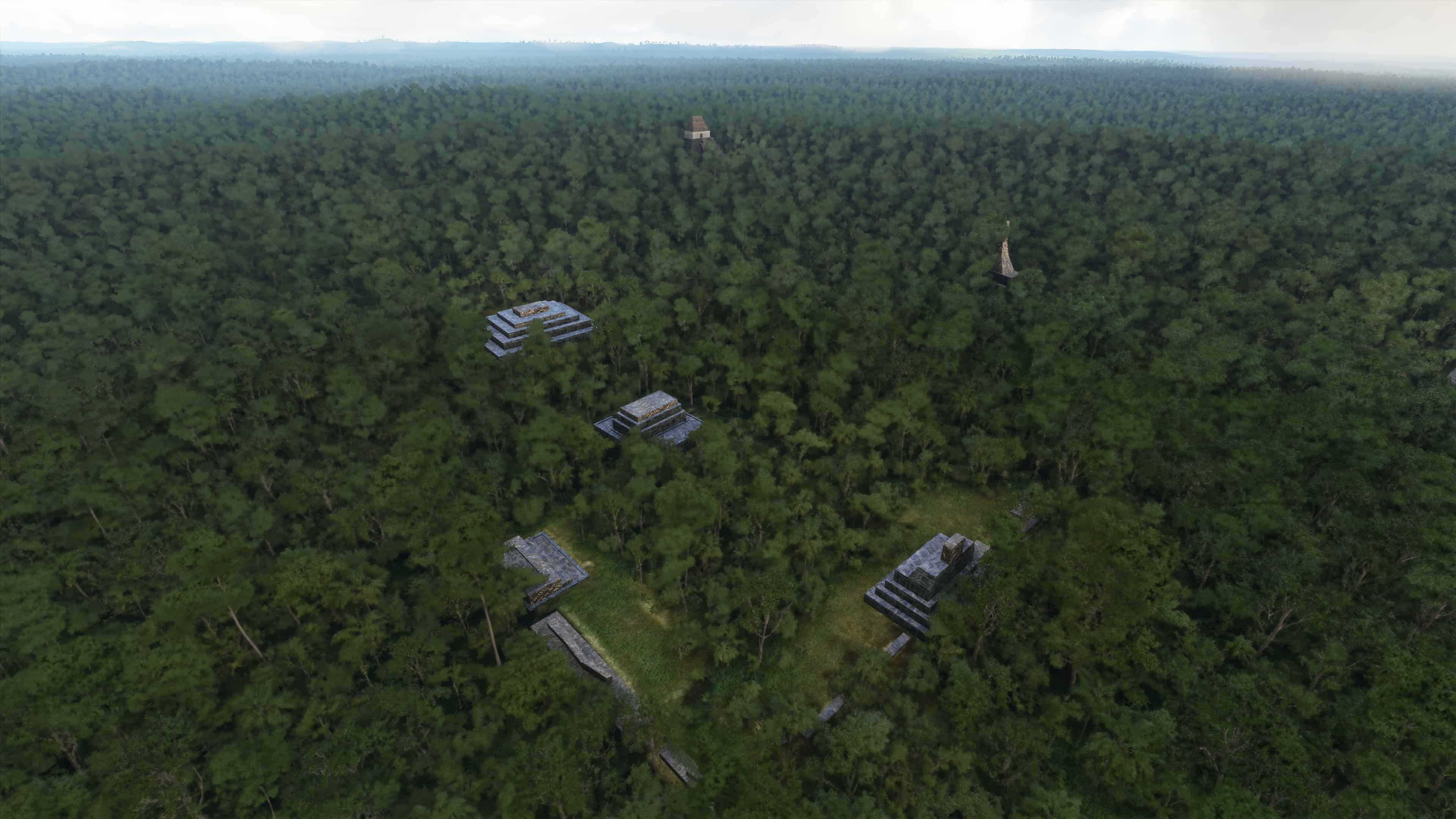 This add-on provides an overhauled representation of the ancient Mayan city of Tikal in Guatemala, as the default scenery represents the area using anachronistic structures. The centerpiece of this add-on is Tikal Temple I, otherwise known as the Temple of the Great Jaguar. This temple is incorporated by using a laser scan model acquired by Open Heritage 3D. Due to the absence of sufficient 3D scans for the other Tikal temples, hand-made assets were used, including various models from 3D Warehouse produced by users Steven D., anyang, and ONIMEX. A Sketchfab model produced by user Room 27 was also used. These models were further modified to include additional details and PBR textures. Other 3D assets were also created from scratch to fill in for many of the various ruins. A few minor terraforming adjustments were made to allow for some of the scenery objects to rest seamlessly on the ground, otherwise, no significant changes were made to the surrounding environment, including trees and satellite imagery. Levels of Detail are included for some of the 3D assets, and some basic night lighting has been incorporated as well.