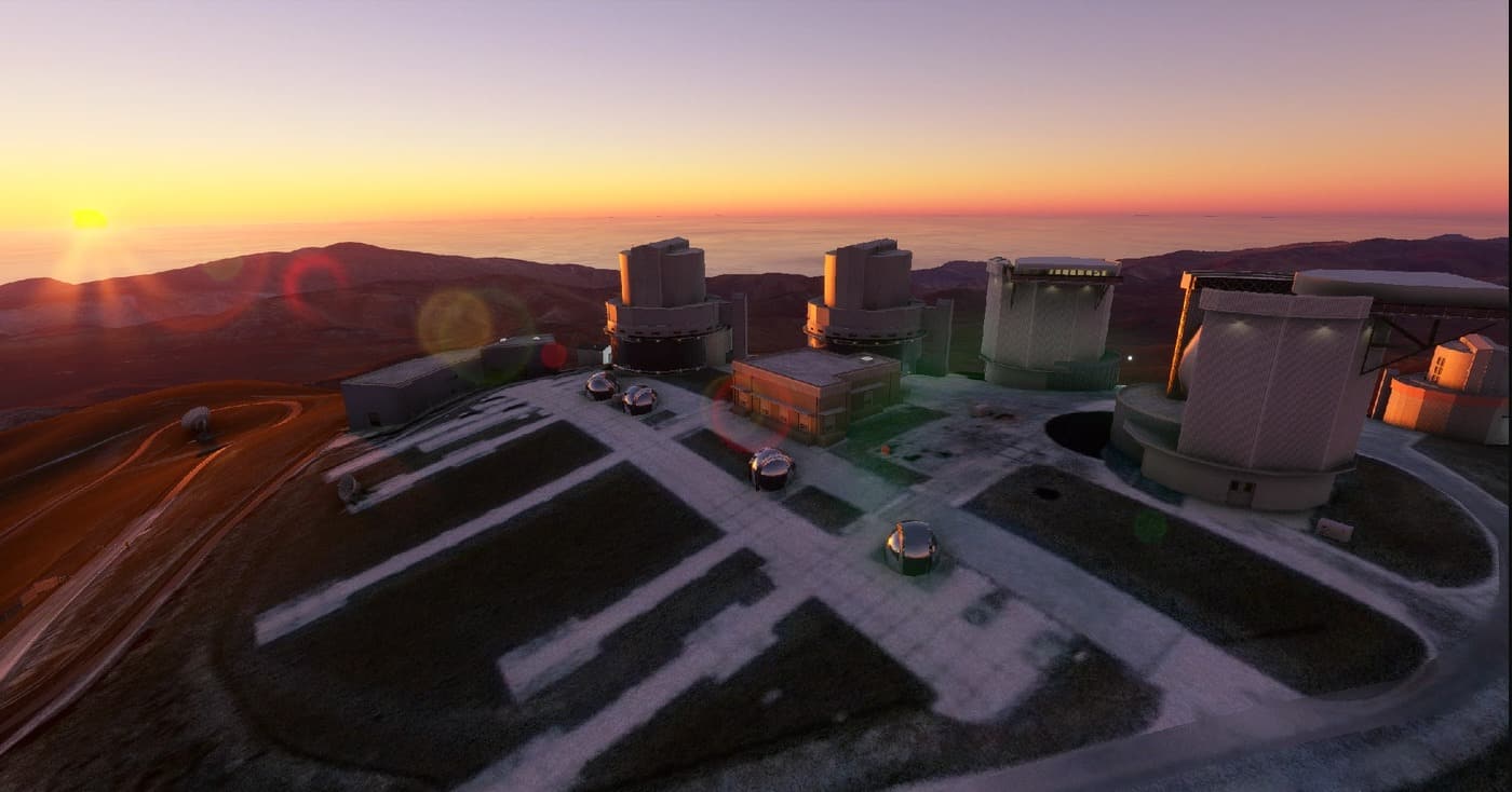 There is an apparently disused aerodrome in the plain present in Flight simulator, excellent for exploring the area of Cerro Paranal where the VLT is located and on the opposite side the Cerro Armazones where the 30-meter E-ELT (European Extremely Large telescope) is under construction