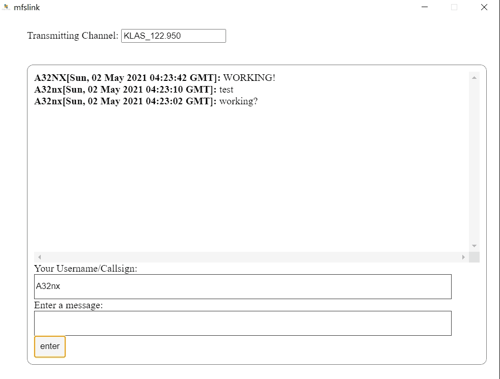 Mfslink is a role playing chatting application created to simulate real live aviation. Mfslink allows users to enter a link_frequency, a specific and easy to understand string that includes ICAO of the airport/center(e.g. KLAS) plus the irl frequency of the position(e.g. Unicom for KLAS is 122.950), an example of link_frequency of KLAS unicome is “KLAS_122.950”. This allows users to chat with people on the same frequency, without mixing frequency with other airports that have the same frequency.