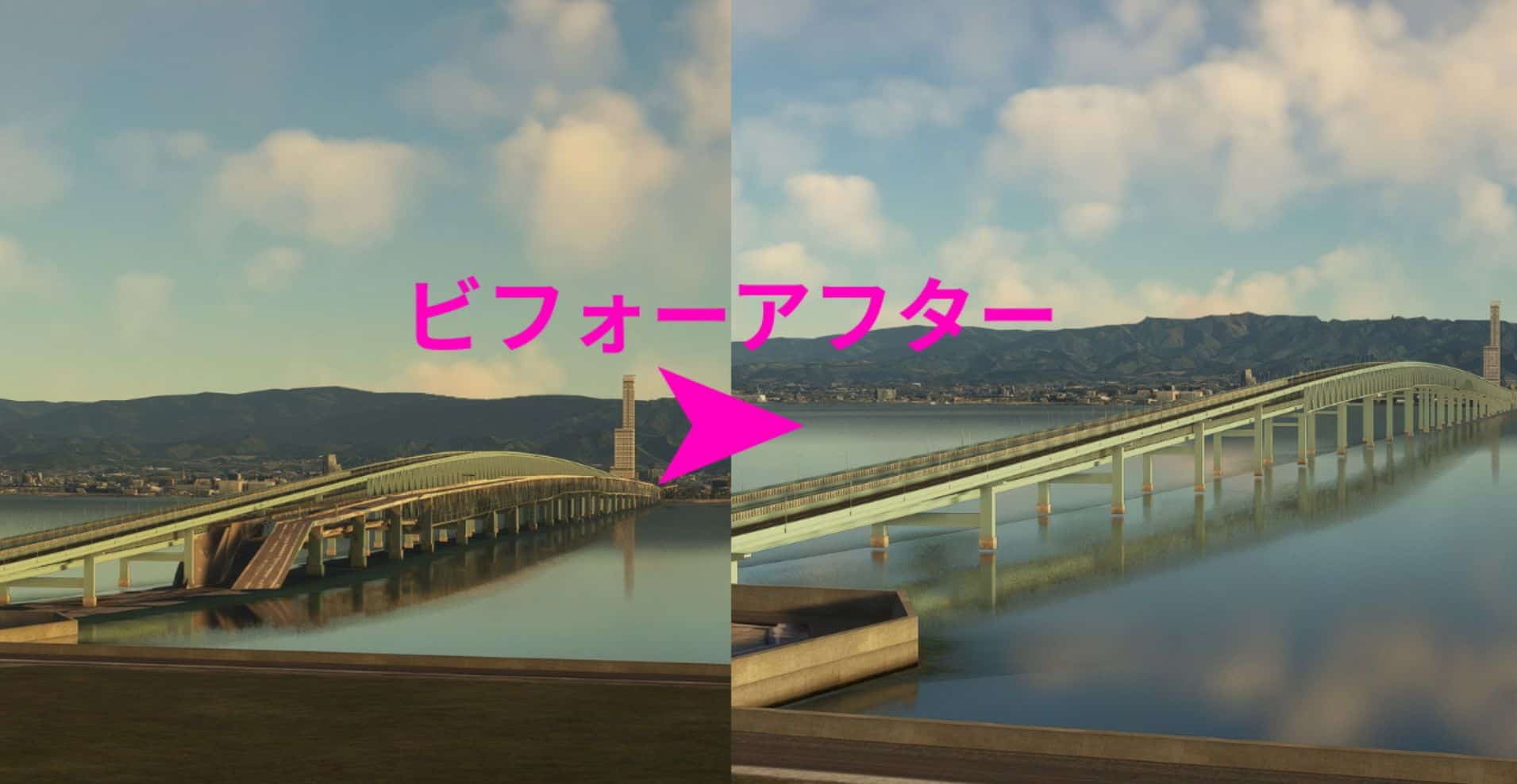 RJBB’s paid scenery, technobrain-RJBB-scenery has an issue where the bridge overlaps with the default bridge, ruining the view. However, by installing the scenery I created, the default bridge will disappear and only the bridge from the paid scenery will remain.