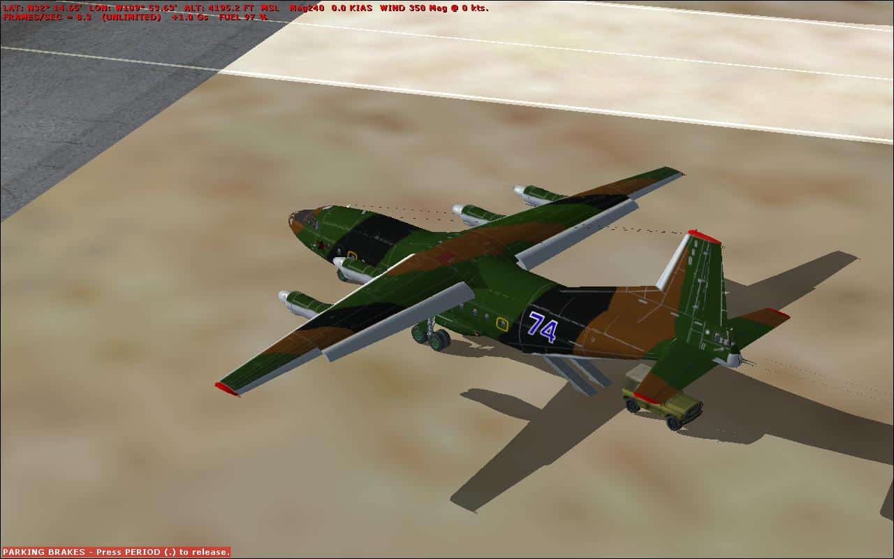 3 repaints for Vladimir Zhyhulskiy’s FS2004/FSX An-12BK. No specific aircraft, just some fun color,ready for remarking,or as is for covert ops/OPFOR use. Desert, European temperate and equatorial temperate cammoflage. Another excellent aeroplane from an FS Master.