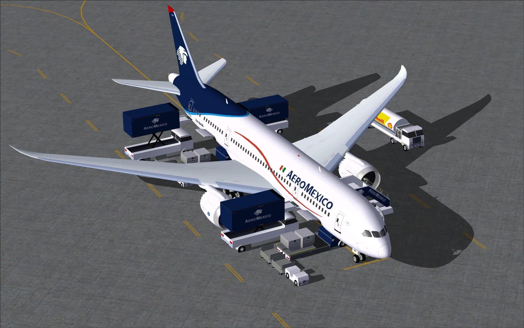 FSX AeroMexico Boeing 787-8 V2, This CamSim Version 2 feature an improve aircraft’s design with new Animated Ground Servicing (AGS). No VC. Model design and paint by Camil Valiquette.