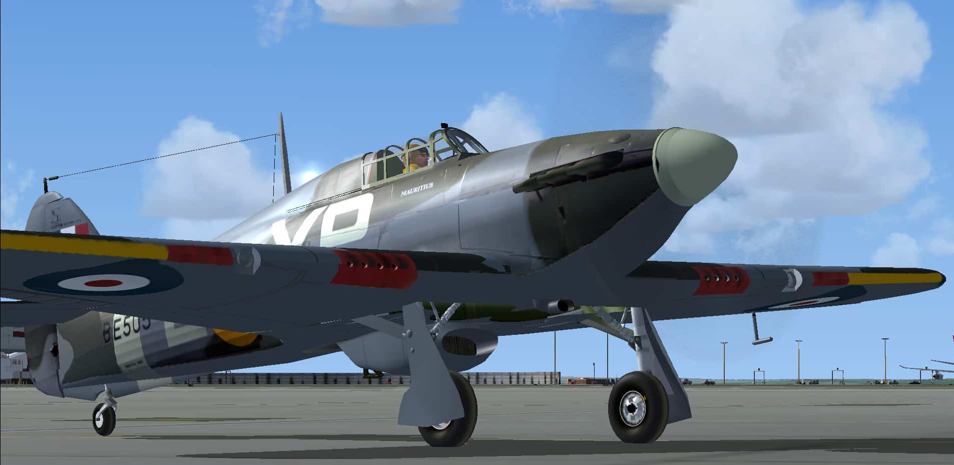 Aeroplane Heaven Hawker Hurricane BE505, with photo real parts and MipMaps removed, I have also changed the sound file. This file includes the gauges previously missing. Tested in Acceleration with Windows 7 SP1 and SP2. Repaint by Stephen Browning