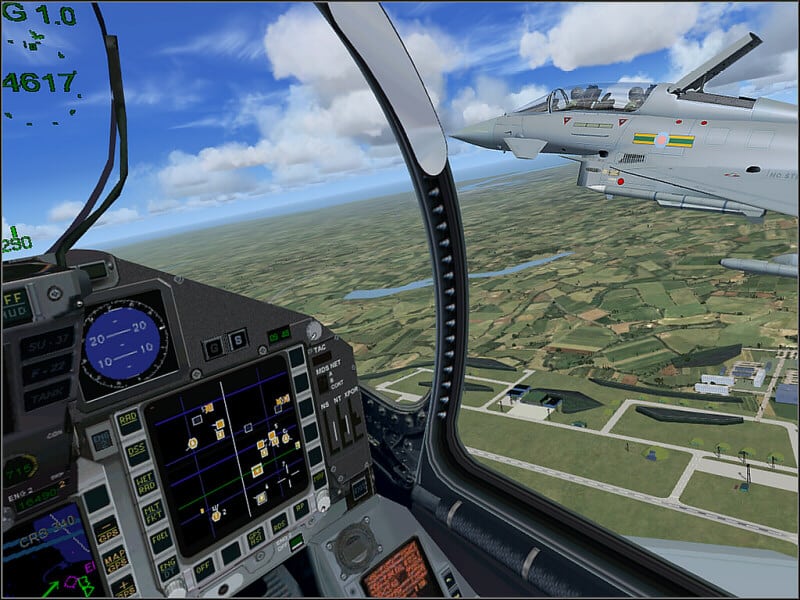 AFS Demo with banners on model and panel: Eurofighter is a single-seat, twin-engine, agile combat aircraft which will be used in the air-to-air, air-to-ground and tactical reconnaissance roles. The design of Eurofighter Typhoon is optimised for air dominance performance with high instantaneous and sustained turn rates, and specific excess power. Special emphasis has been placed on low wing loading, high thrust to weight ratio, excellent all round vision and carefree handling. The use of Stealth technology is incorporated throughout the aircraft’s basic design. This model has a new panel with new gauges ,a new high textures virtual cockpit of authentic Eurofighter – EADS support and new original sound. Models, panel, sound, textures, gauges and animations by www.afs-design.de – Author: A.Meyer.