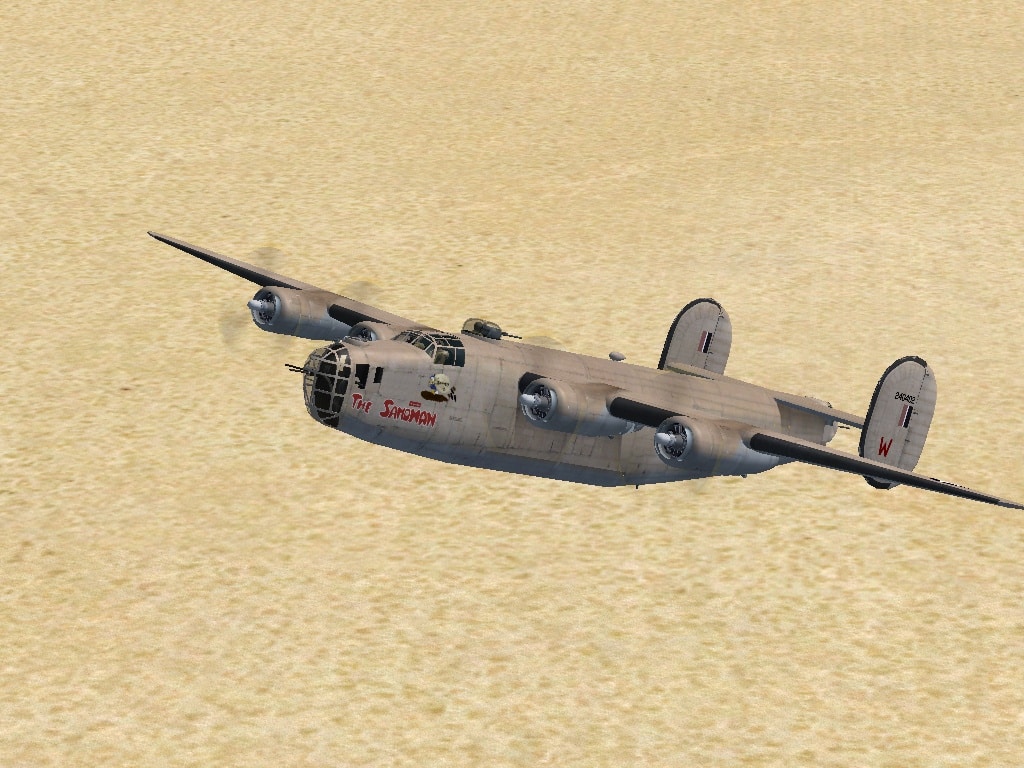 This is a repaint of Alphasim payware B-24D Liberator “The Sandman”. B-24D-55-CO Serial Number 42-40402 9th AF, 98th BG, 345th BS. Robert Sternfels flew the Sandman on the famous 1943 Ploesti raid. The Sandman is pictured in a well known photo of a B-24 just clearing the oil refinery smoke stacks. The plane hit a barrage ballon cable but was able to return to base in North Africa.