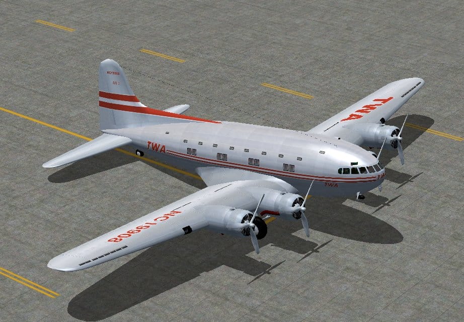 FSX Boeing 307 Stratoliner ver 1.1. The Boeing 307 was the first pressurized airliner. Because of the war, only 10 were built, initially for Pan American and TWA (and a special version for Howard Hughes). Five versions are included here, in PanAm and TWA colours as well as Airnautic and Aigle Azur. This version 1.1 is for FSX only, and has been modified to work correctly with all versions of FSX. By Jens B. Kristensen.