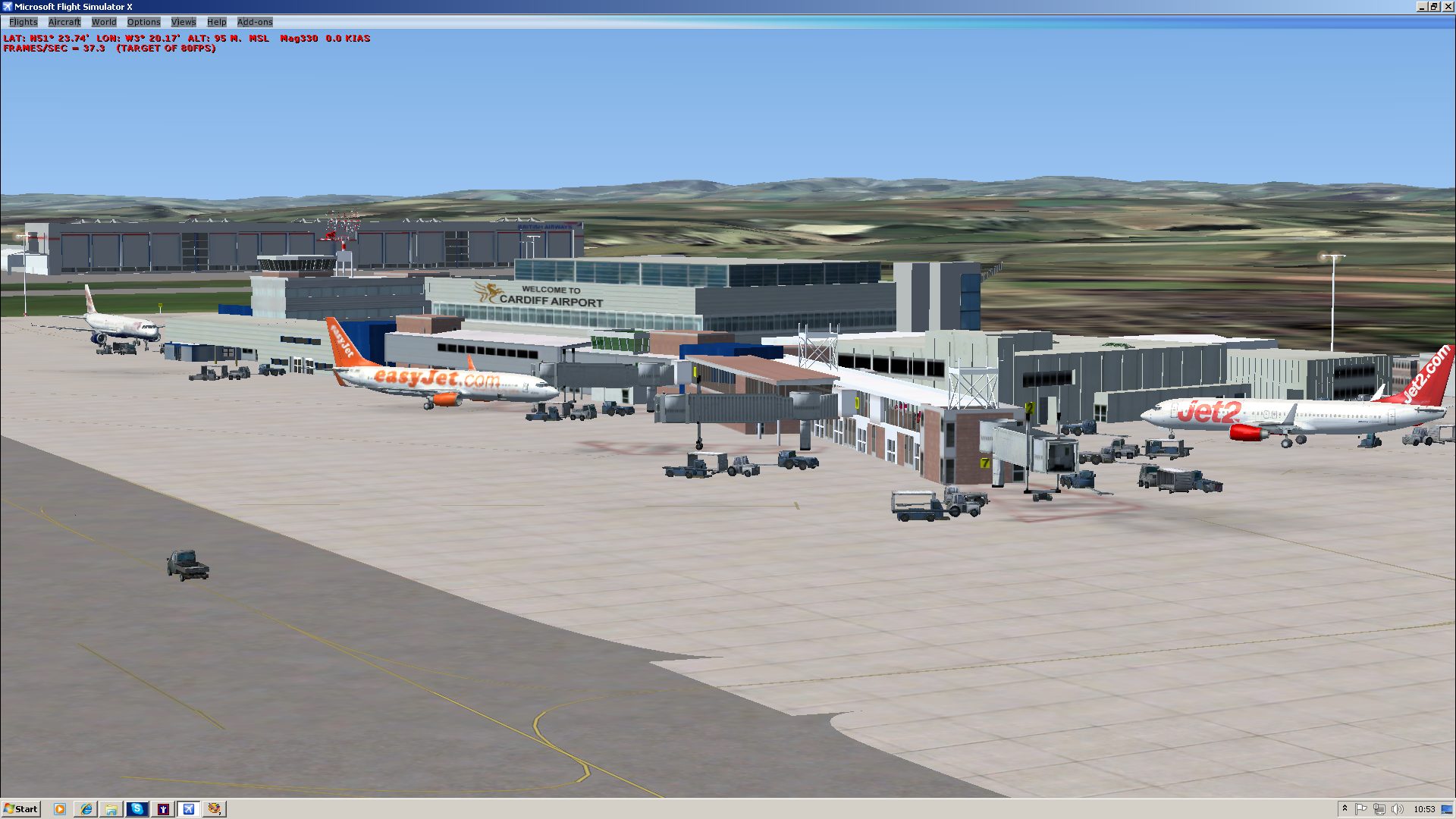 Cardiff UK EGFF. This updated scenery for Cardiff has the new layout at the airport. North side new terminal. Thanks to Jon Masterson for his ADE programme. For fsx only will not work in fs9. Some flashing textures on the glass at gate 9 through 7 but will try to solve it with an update it is an FSX internal fault draw call but i am working on the problem of transparencies in FSX. Hope it does not spoil the scenery too much. Stewart Haworth