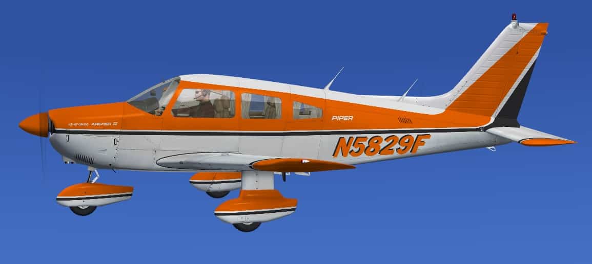 FSX orange and white Piper PA-28-181 Archer II N5829F textures. For the payware Carenado Archer II for FSX which you must have previously installed in FSX. Repaint by Tom Tiedman.