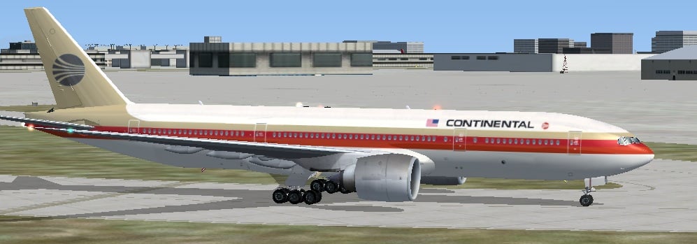 FSX Continental Airlines Boeing 777-200 (fictional old colors). Includes detailed virtual cockpit and inbuilt scenery. Model by Project Open Sky. Repaint by Jim Waters.