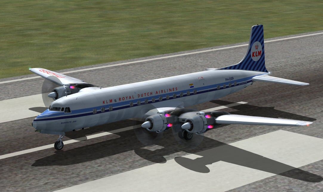 FS2004/FSX DC-7C KLM PH-DSR Barents Sea (Barents Zee) in the “Candy Wrapper” scheme. The KLM DC-7s wore three liveries, this is the second overall, but first “candy wrapper” style. Original aircraft by Greg Pepper and Tom Gibson. Requires calclassic DC-7C package. Repaint by Dan McManus