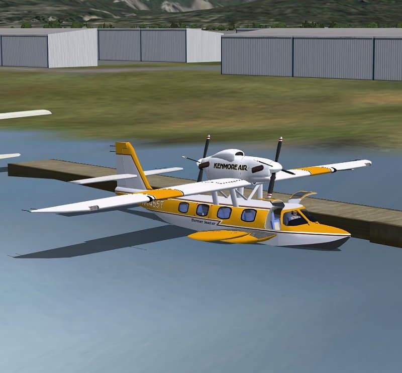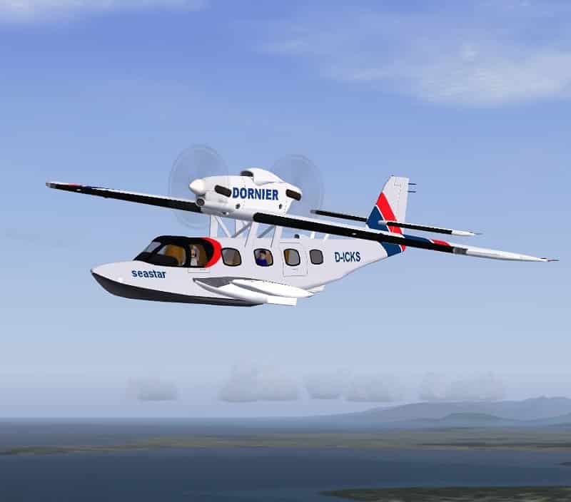 This elegant STOL flying boat amphibian was designed in Germany and is built almost entirely of lightweight, non-corrosive, composite materials. The prototype first flew in 1983 but no production was started at that time. In November 2009 Dornier Seaplane, now based in Florida, USA, announced that production would start in 2011 and the aircraft would be built in Quebec, Canada. The Seastar is powered by two Pratt & Whitney PT-6 turboprops arranged on top of the cantilever parasol wing in a ‘push-pull’ configuration. Twelve passengers can be carried in the short range high density seating configuration or six in the corporate executive cabin. The Seastar can operate from water or land bases, including short grass fields. Complete package for FSX/SP2 including custom panel and VC with both 6 and 12 seat interiors. Custom PT-6 sounds and full moving parts. Realistic and pleasant flight dynamics. The package includes 3 liveries, the prototype Dornier livery, a fictional Kenmore Air livery and a fanciful Canadian Forces Search & Rescue scheme. By Jean-Pierre Brisard & Bob May – Premier Aircraft Design.