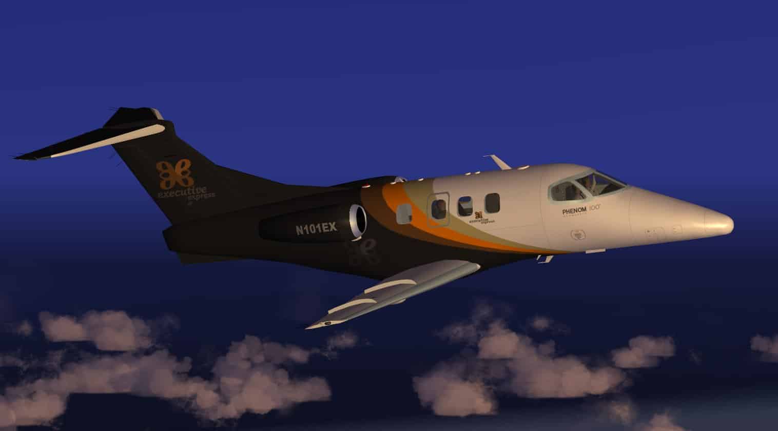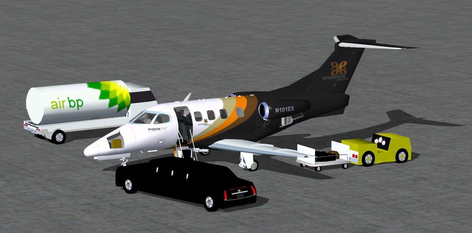 FSX Executive Express Embraer Phenom 100 Biz Jet by CamSim, including exterior Animated Ground Servicing (AGS) and special interior animations and configuration: 4 passengers in seating position and 1 passenger who will stand up and walk back and forth in the cabin and return to is “seating position”, plus pilot and co-pilot moving arms. For these animations press (Shift+E+2). Model design and paint: Camil Valiquette No VC.