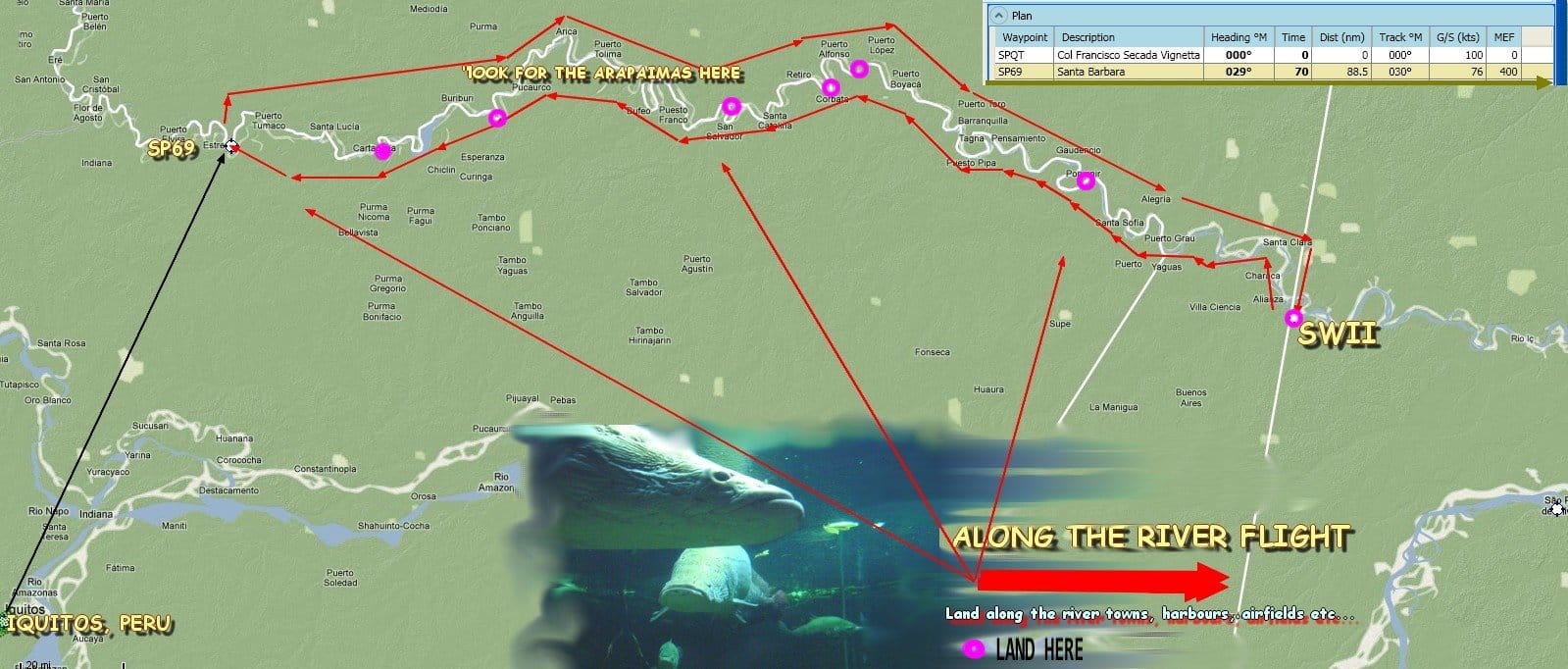 cenery and Flights…The arapaima, pirarucu, or paiche (Arapaima gigas) is a South American tropical freshwater fish. It is a living fossil and one of the largest freshwater fishes in the world. Arapaima can reach lengths of more than 2 m (6.6 ft), in some exceptional cases even more than 2.5 m (8.2 ft) and over 100 kg (220 lbs). The maximum-cited weight for the species is 200 kg (500 lbs). Dr. Amaud Fontain of the Paris Fish Foundation has prepared an expedition leaving from Iquitos in Peru and flying one of the Amazon’s many affluents where this great fish have been seen. Perico del Monte, a local fisherman will fly with the Expedition to the spots where he fishes these monsters. He has assured the Dr. that there are species as large as ten feet and with a weight of over 600 kilos!!!!!. This scenery plus the added flight will engulf the pilot in an unparalleled adventure in one of the most mysterious river on earth…the Amazonas!!!( Flight prohibited to amateur pilots due to the high dangers!)