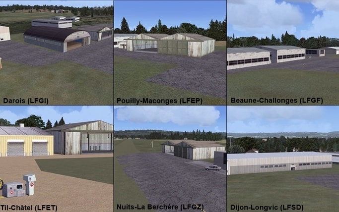 Five FSX terrains around Dijon, France, improved or new, with Beaune-Challanges (LFGF), Dijon-Darois (LFGI), Nuits-Saint-Georges-La Berchere (LFGZ), Pouilly-en-Auxois-Maconge (LFEP), and , Til-Chatel (LFET). Also improved is Dijon-Longvic (LFSD). With a French readme too