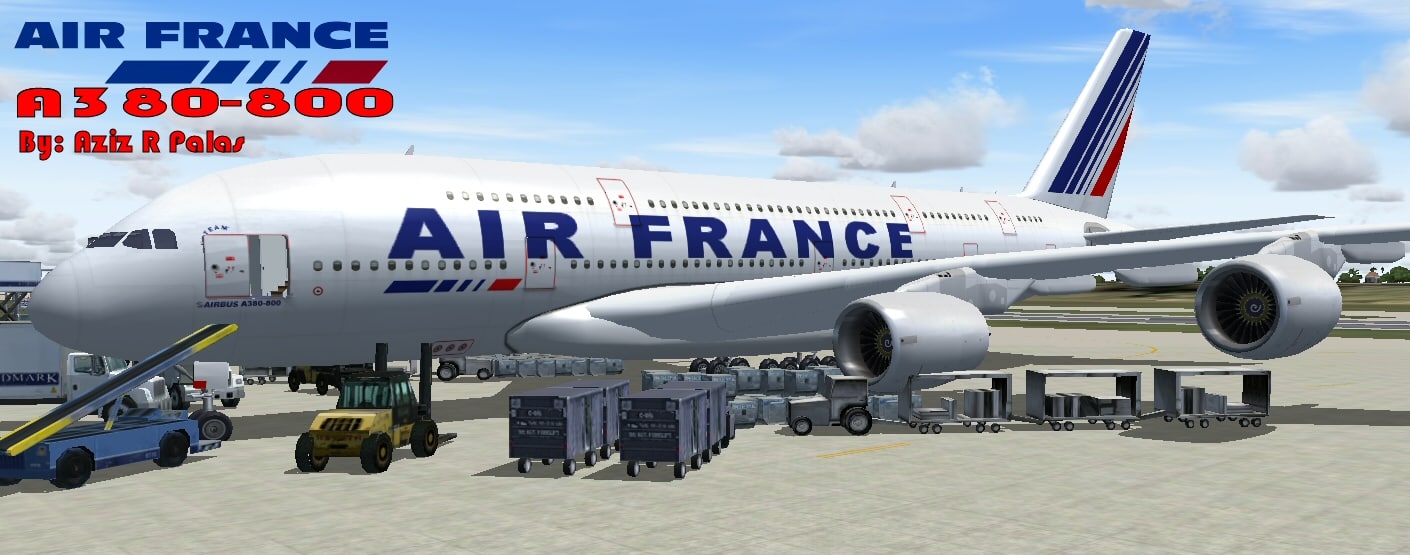 FS2004/FSX Air France A380-800 Air France A380-800, I hope you’ll enjoy the repaint as;I have spent great amount of time to provide you with the most acurate paint along with realistic shadow, shine and reflective effectsFeaturing 32bit Highly Detailed graphics with night light effects,The model includes all the usual things as a steering nosewheel, taxi and landing lights, dynamics shine and all moving parts, including a fully animated landing gear animation. Some special things include three opening doors, with visible interior. Flexing wings, wing views and trim animation for the horizontal stabilisers. Model, dynamics by: Robert Versluys, Repaint By: Aziz Palas.