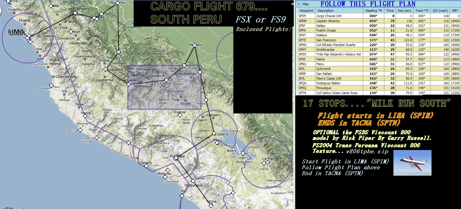 For FSX and FS2004. Two decades of Cargo Flights in the land of the Incas, Peru. A cargo Route over the Andes in the 1950s with a Curtiss C-46 that will test your twin engine experience in some of the highest mountains in South America and a Turboprop Freight Route in the 1960s.Both routes will take the pilot to 21 destinations or to which ever he decides. You will fly all the way from the North to the South of this long country. Expect all kinds of weather in these mountain and tropical skies.