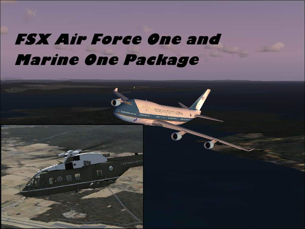 FSX Boeing 747-400 Air Force One, and Eh101 Marine One Textures only Package: This package was created using FSRepaint, and uses the Default FSX 747 and FSX Acceleration Pack EH101. 20MB