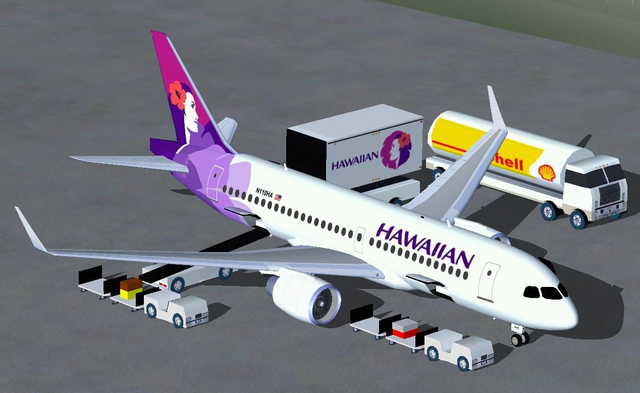 FSX Bombardier CSeries 110 Hawaiian Airlines standard version and optional LR version, including a new Animated Ground Servicing (AGS). Model design and paint by: Camil Valiquette. 1.6MB