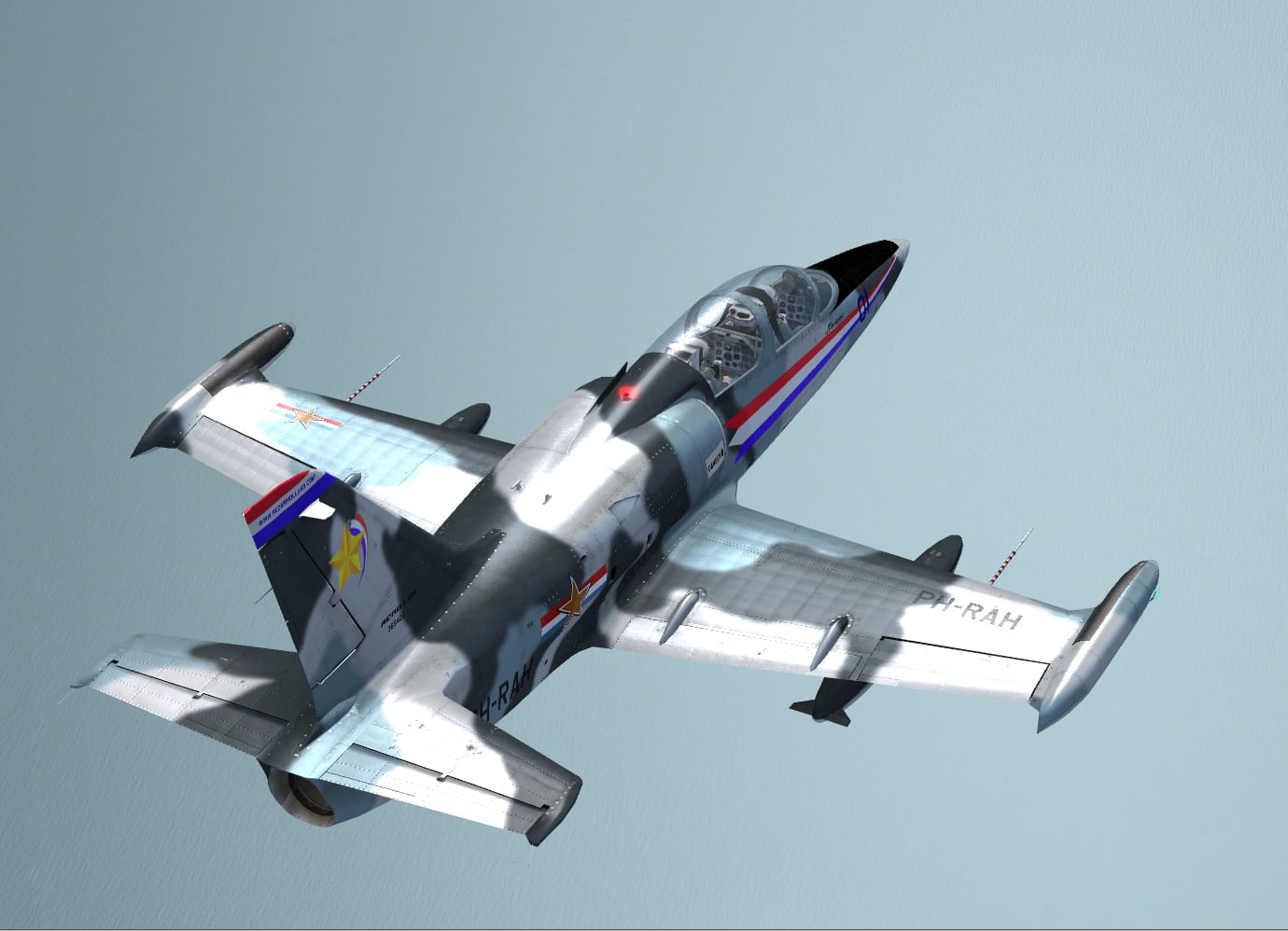 Aero Vodochody L-39 Albatros for FSX by Lotus Simulations in a fictional private “Red Air Holland” livery. Textures only. Since the end of the cold war the Aero Vodochody L-39 Albatros became very popular with private pilots to either collect or fly them in “nostalgic” cold war livery’s. Some (former) military pilots purchased/leased the relatively cheap L-39 in order to sell flight-time to train (Airborne) Forward Air Controllers or to provide military flying units (all kind) some realistic flying opposing forces units during exercises. This livery represents such a private company, the fictional Dutch “Red Air Holland” L-39C for (A)FAC training and OPFOR services. The livery is a privately purchased former Royal Thai Air Force L-39C with freshly applied RAH markings and striping. The company logo is inspired by the Kalashnikov factory logo, but with Dutch colors. The L-39C has a civil registration as well as the original RTAF serial number. Though this paint is purely fictional, some L-39’s are used for the above discribed servises, and their number is ever growing. You need the excellent payware Aero L-39 by Lotus Simulations in order to use this repaint. Enjoy!