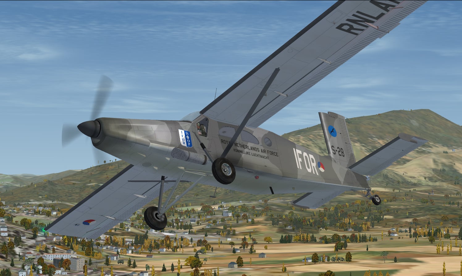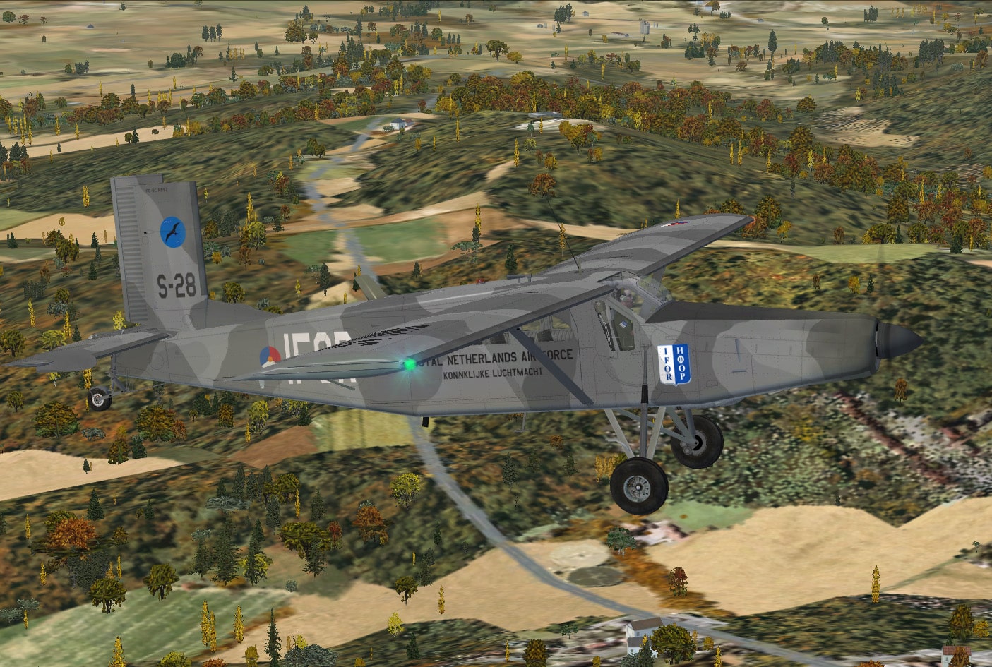 Pilatus PC-6C H2 Turbo Porter for FSX by Tim Conrad in a Royal Netherlands Air Force livery. The PC-6C Turbo Porter has been an amazing contribution to the STOL aircraft fleet around the world for decades. It’s robust airframe and excellent aerodynamics make the plane very popular for para-drops, but also for supply missions in remote area’s throughout the globe. Despite it’s age the aircraft is still widely in use. This repaint represents a “what-if” RNLAF PC-6C in toned down camouflage 336 Sqn colours, IFOR, Sarajevo 1996. The Sqn logo is the old Curacao (Netherlands Antilles) 336 version which back then ended their F-27 Maritime operations. The RNLAF did participate in the Former Yugoslav, Bosnian peace enforcing operation with aircraft including C-130’s, F-16’s, and BO-105CB’s. The aircraft shares the same registration as my earlier Surinam based livery (PC-6C_KLU.zip), but weathered, tone-down camouflage and 24 years later. You need the excellent freeware PC-6C H2 Turbo Porter by Tim Conrad in order to use this repaint. Enjoy!